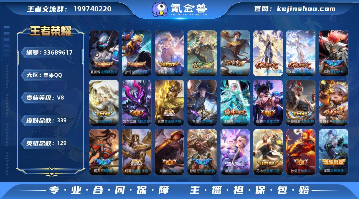 【Hwz1377】【特价出售】苹果Q区-V8-可二次-339皮肤-2典藏皮肤-23传说-105史诗(无限飓风号、全息碎影、长夜焕生、愿照山河定、枫霜尽、李逍遥、琥珀纪元) 【英雄全皮】:刘邦全皮,孙权全皮,橘右京全皮,鬼谷子全皮,黄忠全皮,敖隐全皮,蒙恬全皮 【荣耀典藏】:孙悟空全息碎影,夏侯惇无限飓风号 【传说皮肤】:王昭君长夜焕生,后羿神树通天,司空震愿照山河定,女娲愿照千秋盛,马超琥珀纪元,虞姬无限倾心,橘右京枫霜尽,鲁班七号寅虎瑞焰,曜李逍遥 ,诸葛亮时雨天司,铠绛天战甲,镜炽阳神光,虞姬启明星使,孙悟空零号赤焰,李信一念神魔,刘备时之恋人,干将莫邪久胜战神,达摩黄金狮子座,花木兰冠军飞将,后羿黄金射手座,貂蝉仲夏夜之梦,宫本武藏地狱之眼,孙悟空地狱火 【限定皮肤】:狄仁杰阴阳师,赵云皇家上将,墨子神迹守卫,嬴政优雅恋人,孙尚香蔷薇恋人,鲁班七号狮舞东方,鲁班七号寅虎瑞焰,庄周高山流水,高渐离玩趣恶龙,阿轲迷踪丽影,白起夜都怪侠,芈月重明,芈月白晶晶,芈月幻夜卜梦,周瑜赤莲之焰,元歌云间偶戏,元歌无心,夏侯惇朔风刀,典韦穷奇,典韦蓝屏警告,马可波罗暗影游猎,狄仁杰魔术师,狄仁杰万华元夜,达摩星际陆战队,达摩...