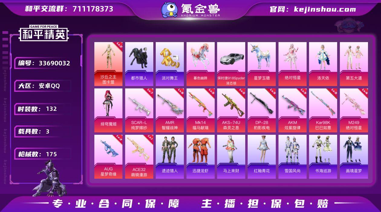 【kyhp1994】安卓 手Q-1神装-4粉装-10特效枪-3载具-4粉色飞行器-58563热力值-12王牌印记-132套装-175枪皮 【红色神装等级】:沙丘之主-图卡盟(二级) 【红色角色神装】:沙丘之主-图卡盟 【热门品类】:套装-都市猎人,套装-派对舞王,套装-龟仙人,套装-红熊茄茄 【粉色套装】:角色-绝对恒星,角色-洛天依,粉装-第五大道,角色-绯穹魔姬 【粉色枪皮等级】:AKM-炫紫旋律(五级),SCAR-L-纯梦嫁纱(七级),AUG-星梦奇缘(三级),ACE32-萌骑漫游(一级),AKS-74U-森灵之息(五级),Kar98K-巳巳如意(五级),Mk14-福马献瑞(五级),AMR-智耀战神(六级),M249-绝对恒星(四级),DP-28-豹影疾电(五级) 【粉色载具】:保时捷918 Spyder(液态银),星梦玉骢,暮色幽蹄 【粉色枪皮】:AKM-炫紫旋律,SCAR-L-纯梦嫁纱,AUG-星梦奇缘,ACE32-萌骑漫游,AKS-74U-森灵之息,Kar98K-巳巳如意,Mk14-福马献瑞,AMR-智耀战神,M249-绝对恒星,DP-28-豹影疾电 【粉色飞行器】:绝对恒星飞行器,香车宝马飞行器,暮色之舞飞行器 【粉色降落伞】:绝对恒星降落伞,星之彼岸降落伞,洛神天依降落伞,旋转彩虹降落伞,星梦奇缘降落伞,智耀战神降落伞,喜羊羊与灰太狼降落伞,异瞳寒姬降落伞,炫彩糖果...