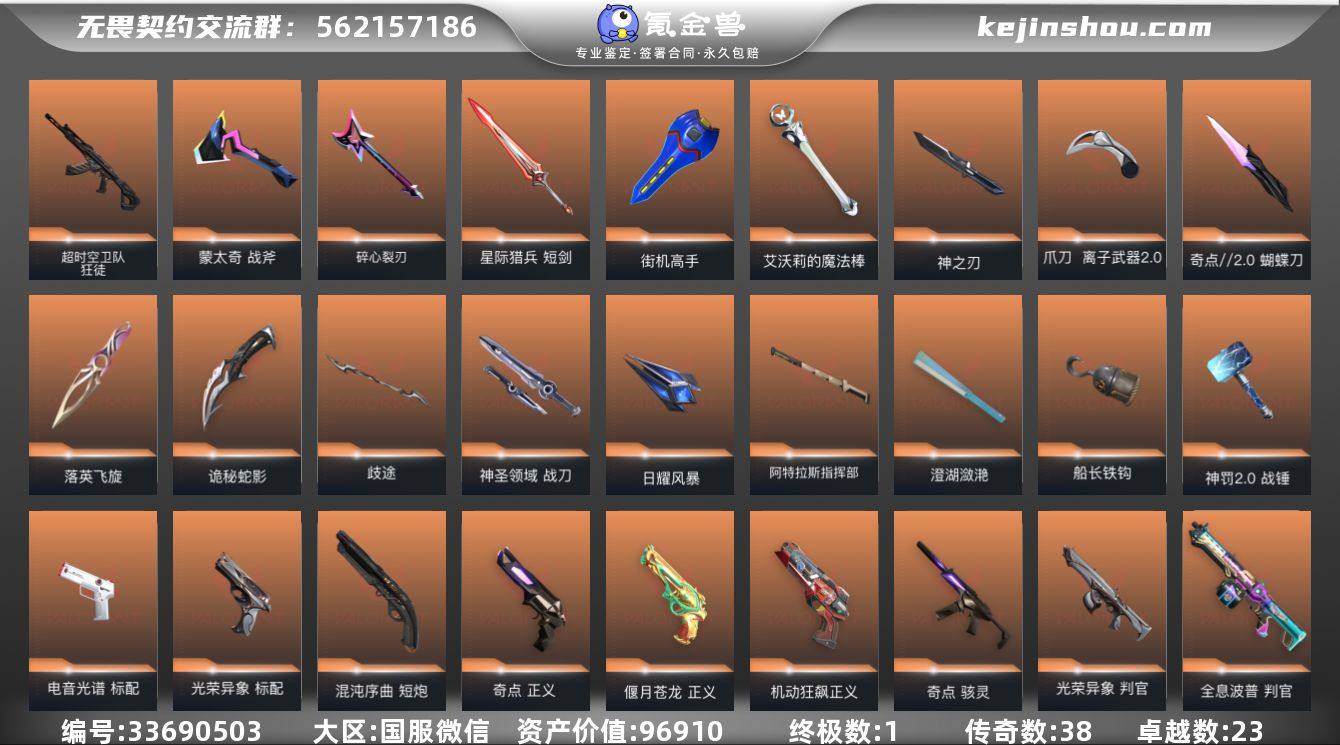 段位: 未定级 套装: 神罚套装,海洋之星2.0套装,离子武器2.0,神中神罚套装,光荣异象 近战武器皮肤: 澄湖潋滟,落英飞旋-千灵华绽,街机高手-源能者娱乐系统,艾沃莉的魔法棒,蝴蝶刀-奇点//2.0,神圣领域 战刀,船长铁钩-海洋之星2.0,离子武器2.0 爪刀,诡秘蛇影,神罚2.0 战锤,神之刃-神中神罚,光荣异象 歧途,日耀风暴,阿特拉斯指挥部,星际猎兵 短剑,碎心裂刃,蒙太奇 战斧 步枪皮肤: 狂徒-紫阙金琅,戍卫-盖亚的复仇,幻影-侦察力量,戍卫-天界神兵,狂徒-盖世英雄,狂徒-机动狂飙,狂徒-塑水宗,狂徒-洪荒怒焰,狂徒-日冕雄师,狂徒-全息波普//2.0,幻影-黯夜怪谈,狂徒-创·纪元,幻影-海洋之星2.0,獠犬-海洋之星2.0,狂徒-离子武器2.0,幻影-神中神罚,狂徒-光荣异象,狂徒-超时空卫队,狂徒-滋滋X特攻队,幻影-混沌序曲2.0,超集系统 狂徒,蒙太奇 幻影,风暴之子 戍卫 佩枪皮肤: 正义-奇点,鬼魅-盖亚的复仇,正义-偃月苍龙,正义-机动狂飙,短炮-混沌序曲,标配-海洋之星2.0,狂怒-离子武器2.0,狂怒-神中神罚,标配-电音光谱,标配-光荣异象,鬼魅-掠影2.0,超集系统 标配,风暴之子 正义,蒙太奇 狂怒 狙击枪皮肤: 冥驹-偃月苍龙,冥驹-堕天遗武,莽侠-RGX 11z Pro 3.0,莽侠-神中神罚,冥驹-光荣异象,风暴之子 冥驹,...