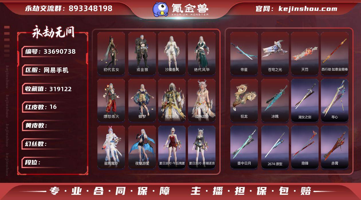 YJJ2396/5.15换绑/等级424/s20三人黄金5/16红531金收藏值319122/16红色神品:/初代玄女/星辉魔纱/化生明王/戎金狼/熛怒炼火/蝶梦/泣珠龙纱/绝代风华/沙漠香风/夜魅游莹/冰魄_/帝星/如意金箍棒/狂龙/天罚/苍穹之光/宁红夜:/初代玄女/倒反阴阳炽羽/耀世魂花/红川仙子/夜华朝/午后瑰夏/紫金玉女/玄豹姿/碧水青天/簪缨发/云霞发/双马尾女 沈妙:/星辉魔纱/秋藏桂/悠竹萌客/云溪仙子/楚韵九歌山鬼/絮云衣/百灵发/娇憨发/双马尾女 天海:/化生明王/少林/九骊之君/白熊/若水尊者/八宝龙王/缘觉发/双马尾男 殷紫萍:/风雨谐/萍之缘/鹅黄纱梦/沐昭/流纨裙/兰庭月/瑶光沐月/子菀发/紫芙发/苏木发/暖绒发/双马尾女 特木尔:/戎金狼/红蓝狂想/唐三/多闻天王/街头梦语/噬月天狼/追猎/苍狼之主/海神发/双马尾男 季沧海:/熛怒炼火/杰洛特/不良人李星云/巨阙/龙心炽焰/江海沧澜/江海发/含锋发/不如吾发/白狼发/双马尾男 胡桃:/蝶梦/山吹茶/承云兰寿/辉烨少女/清雅少女/月丹发/月下香发/木棉发/双马尾女 妖刀姬:/热海白珊 崔三娘:/泣珠龙纱/湘夫人/暗沼摩罗/探海裙/巨鲸客/无拘/赤雾烟霞/弄潮逐浪/碎浪发/安澜发/鲸海发/冷傲发/双马尾女 岳山:/杨戬/铁面/尼尔/弘毅袍/过江龙/玄鳞发/双马尾男 无尘:/...