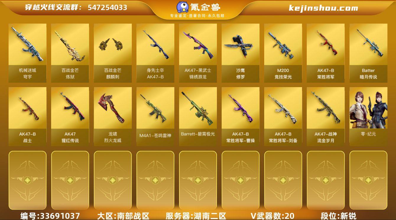 湖南二区-21V-0王者武器数-0炫金武器数 【热门武器】:M200-竞技荣光,USP-雷暴,沙鹰-修罗 【音效卡】:Barrett-碧霄极光音效卡*2,麒麟刺-百战金芒-盛典舞曲音效卡,炼狱-百战金芒-庆典舞曲音效卡 【皮肤】:M4A1-再燃火线,战神-流金岁月皮肤,AK47-B-常胜将军-曹操*2,AK47-B-常胜将军-刘备,修罗-百战金芒 皮肤,轻型军用手斧-再燃火线 【角色】:零·纪元,云海玲珑,葵-阿尔法武装,暗夜-X,初恋灵狐,电竞少女,芳心审判者,风暴女,娟娟,灵狐者-X,潘多拉-X,潜龙队-X,青霞仙子,斯沃特-X,新娜塔莎,雪莉杨-摸金校尉,樱-战斗天使,影武者-X,游珑儿,团团 【人偶武器】:夺魂,迷你牛牛,灵狐娃娃手雷 【挑战大师】:冰龙粉碎者-白马银枪,神圣爆裂者-末日III 【英雄级武器】:黑武士-锦绣游龙,AK-47-猩红传说,AK47-B-常胜将军,机械迷城-穹宇,AK47-B-身先士卒,AK47-B-战士,M200-竞技荣光,Barrett-暗月传说,炼狱-百战金芒,沙鹰-修罗,USP-雷暴,麒麟刺-百战金芒,龙啸-烈火龙威,手雷-云海游龙,闪光弹-竞技荣光,烟雾弹-竞技荣光,M4A1-苍鸣雷神,AK47-竞魂无影,Barrett-碧霄极光 【其他武器】:源·火麒麟*4,御·火麒麟-平天大圣,御·黑龙-龙太子,源·...