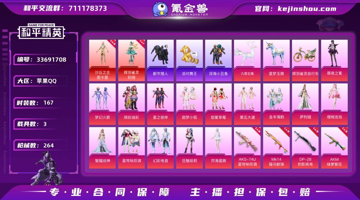 【无法转区 4级图卡盟 初翊 都市 金鞋 新101 智耀战神 猪妹 小狐 番茄 晶辉 哥特 满地铁天赋】YXc29015-【可二次】【因赛季更新游戏段付以上号为准!】 苹果Q-2红装4稀有3载具15粉装20特效枪11热门167套装264枪皮 12印记 历史传奇王牌21星 【2红装】 辉羽雀灵-初翊 (1级) 沙丘之主-图卡盟 (4级) 【4稀有】 都市猎人 浪漫天命 派对舞王 派对舞王(金靴子) 【3载具】 九霄玄鹿 星梦玉骢 辉羽雀灵自行车 【15粉装】 狂魅哈莉 梦幻火箭 萨利娅 荧海星豚 金丰海韵 樱桃泡泡 星穹咏叹调 罪夜之冕 智耀战神 幻彩电音 缤纷油彩 第五大道 甜蜜草莓 星之彼岸 甜梦小狐 【20特效枪】 SCAR-L-锦绣绵绵 (5级) M416-灵猫魔法师 (3级) P90-沙丘之主 (3级) AKS-74U-森灵之息 (1级) AKS-74U-星穹咏叹调 (6级) AKM-绿萝繁花 (5级) Kar98K-圣域龙灵 (3级) Kar98K-巳巳如意 (5级) MG3-辉羽雀灵 (3级) DP-28-豹影疾电 (5级) MK12-雪月幻音 (4级) AMR-智耀战神 (5级) AUG-星之彼岸 (3级) M417-第五大道 (5级) 信号枪-金乌曜日 (1级) Mk14-福马献瑞 (5级) AA12-G-萌骑幻想 (2级) PKM-萌骑夺宝 (2级) UMP45-萌骑冒险 (2级) ACE32-萌骑漫游 (3级) 【11热门】 龟仙人 六号稻草人 红熊茄茄 恶魔人...