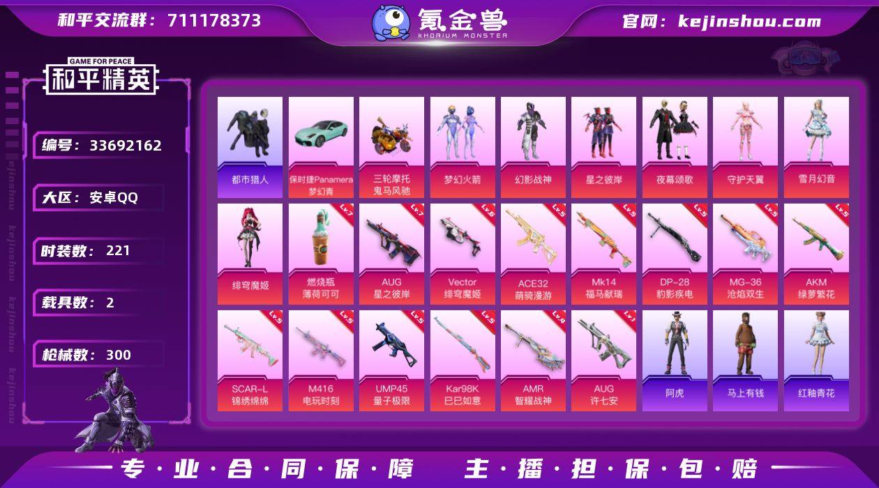 【kyhp959】安卓 手Q-7粉装-14特效枪-2载具-3粉色飞行器-89611热力值-19王牌印记-221套装-300枪皮 【热门品类】:粉装-梦幻火箭,套装-浪漫天命,套装-都市猎人,套装-小丑鱼,套装-忍者信条,套装-龟仙人,角色-Mark.06 【粉色套装】:粉装-幻影战神,粉装-梦幻火箭,粉装-星之彼岸,粉装-夜幕颂歌,角色-守护天翼,粉装-雪月幻音,角色-绯穹魔姬 【粉色枪皮等级】:AKM-绿萝繁花(五级),SCAR-L-锦绣绵绵(五级),M416-电玩时刻(五级),AUG-星之彼岸(七级),AUG-许七安(一级),ACE32-萌骑漫游(五级),UMP45-量子极限(五级),Vector-绯穹魔姬(六级),Kar98K-巳巳如意(五级),Mk14-福马献瑞(五级),AMR-智耀战神(四级),DP-28-豹影疾电(五级),MG-36-沧焰双生(五级),燃烧瓶-薄荷可可(七级) 【粉色载具】:保时捷Panamera(梦幻青),鬼马风驰 【粉色枪皮】:AKM-绿萝繁花,SCAR-L-锦绣绵绵,M416-电玩时刻,AUG-星之彼岸,AUG-许七安,ACE32-萌骑漫游,UMP45-量子极限,Vector-绯穹魔姬,Kar98K-巳巳如意,Mk14-福马献瑞,AMR-智耀战神,DP-28-豹影疾电,MG-36-沧焰双生,燃烧瓶-薄荷可可 【粉色飞行器】:炫彩糖果飞行器,圣域金龙飞行器 【粉色降落伞】:绝对恒星降落伞,幻...