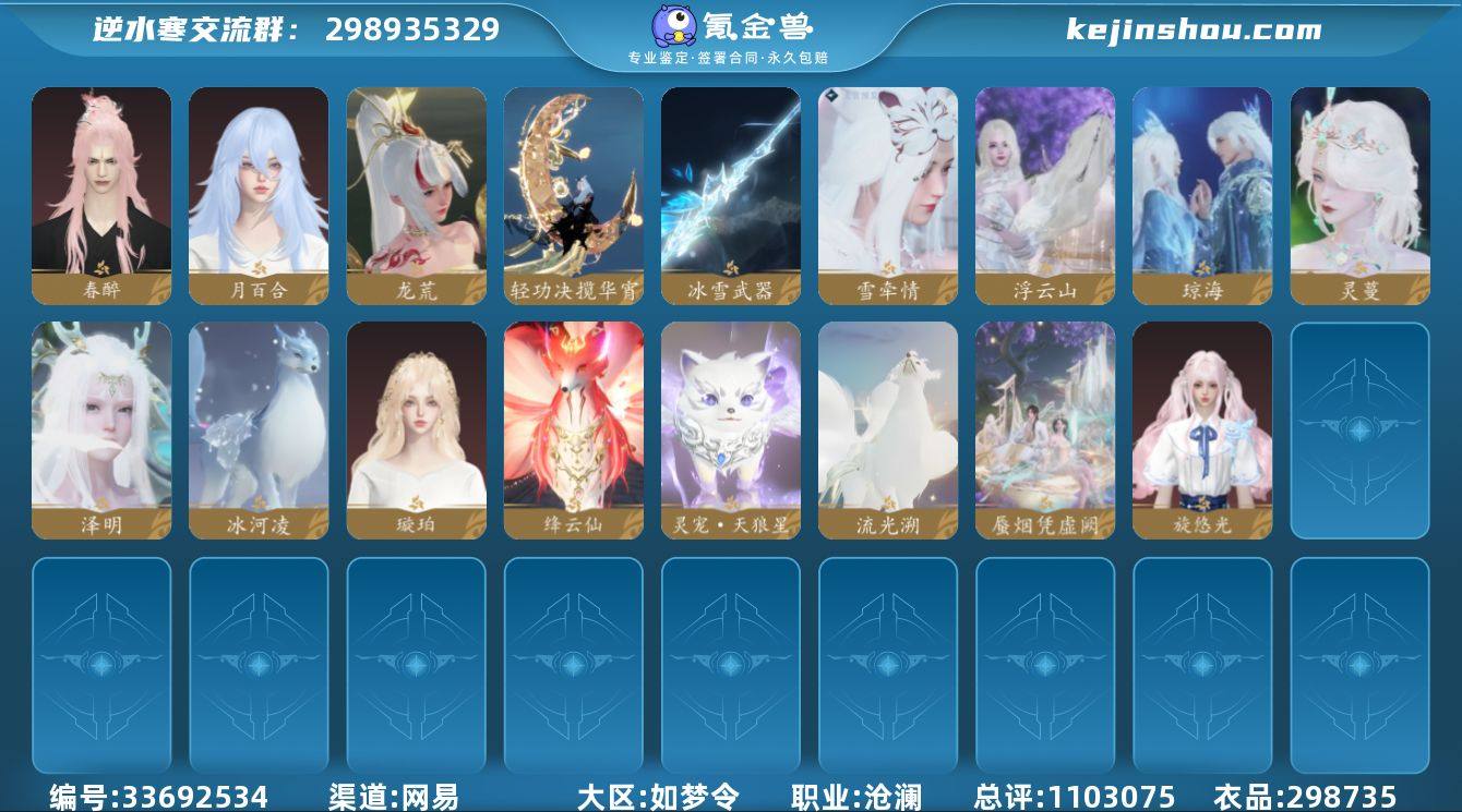 稀有外观: 旋悠光 天赏石外观: 白发雪牵情,冰狐冰河凌,五尾狐流光溯,金发浮云山,琼海,冰雪武器,轻功决·揽华宵,灵蔓,白发泽明,蜃烟凭虚阙,龙荒,绛云仙,灵宠·天狼星,璇珀,月百合,春醉【区服】 刀剑如梦 【充值称号】 把酒临风 【已用天赏石】 27 【天霓染数量】 1 【天霓染】 娇俏毒物*1 【时鉴赏】 时鉴赏一期10级 【转盘外观】 旋悠光 【天赏发型】 琼海, 蚀日, 浮云山, 春醉, 雪牵情, 月百合, 璇珀, 龙荒, 泽明, 灵蔓 【天赏祥瑞】 绛云仙, 蜃烟凭虚阙, 冰河凌, 流光溯 【天赏外观】 冰雪武器, 轻功诀揽华宵 【天赏灵宠】 灵宠·天狼星 【副本外观】 星落月皓 【配饰】 犯逆鳞, 曦轮韶光, 烟波渺, 桃心锁契 【商城外观】 皎华望月, 炽烈狂想, 舞乐火霓, 甜梦晴海, 枫华九霄, 破曙征潮, 极夜天曦, 逸夏浮澜, 月光奏鸣, 窃月影姬, 幻核星芒, 甜宙漫游, 青烟妩醉, 烟雪清菡, 夜雪闻梅, 桃花雪, 巧影逐光, 金缕漠歌, 赤乌驰阙, 夜雨倾澜, 猩红猎夜, 粉蔷曳风, 苍蓝微风, 金筹曜夜, 雪团云绒, 潇湘黛影, 羽信絮梦, 烹椒听雀, 幽蝶魅影, 幻音星缘, 暗蔷魅影, 音律织光, 云绣露华, 天籁闻歌, 跃动心芒, 朔雪从风, 逍遥千风, 蝎影度月, 云腾游雾, 灵语星彩, 悬蛛结心, 川峦游墨, 芳汀...