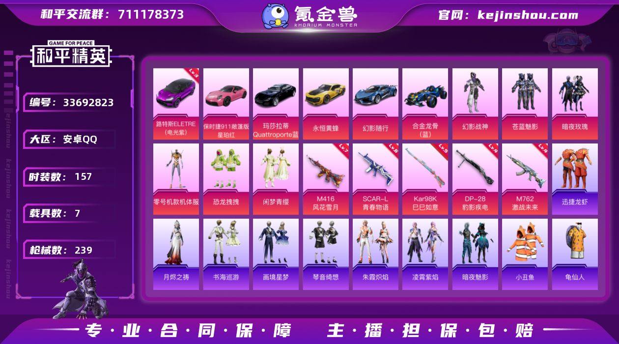 安卓 手Q-6粉装-5特效枪-7载具-4粉色飞行器-80605热力值-12王牌印记-157套装-239枪皮 【红色载具】:路特斯ELETRE(电光紫)(三级) 【热门品类】:套装-小丑鱼,套装-龟仙人 【粉色套装】:粉装-幻影战神,粉装-苍蓝魅影,粉装-暗夜玫瑰,角色-零号机款机体服,粉装-恐龙拽拽,粉装-闲梦青缨 【粉色枪皮等级】:SCAR-L-青春物语(六级),M416-风花雪月(七级),M762-激战未来(四级),Kar98K-巳巳如意(五级),DP-28-豹影疾电(四级) 【粉色载具】:路特斯ELETRE(电光紫),玛莎拉蒂Quattroporte(夜幕蓝),保时捷911 敞篷版(星珀红),永恒黄蜂,幻影随行,合金龙骨(蓝) 【粉色枪皮】:SCAR-L-青春物语,M416-风花雪月,M762-激战未来,Kar98K-巳巳如意,DP-28-豹影疾电 【粉色飞行器】:星之彼岸飞行器,梦之光华飞行器,青春物语飞行器,纯梦嫁纱飞行翼 【粉色降落伞】:粉色回忆降落伞,炫紫旋律降落伞,激战未来降落伞,暗翼战神降落伞,王牌四分卫降落伞,相思残雪降落伞,梦之光华降落伞,烈焰拳霸降落伞,碧影闪光降落伞,恐龙拽拽降落伞,旋转彩虹降落伞,暗夜鎏金降落伞,变形金刚降落伞,樱桃泡泡降落伞,智耀战神降落伞,幻彩电音降落伞,喜羊羊与灰太狼降落伞 【...
