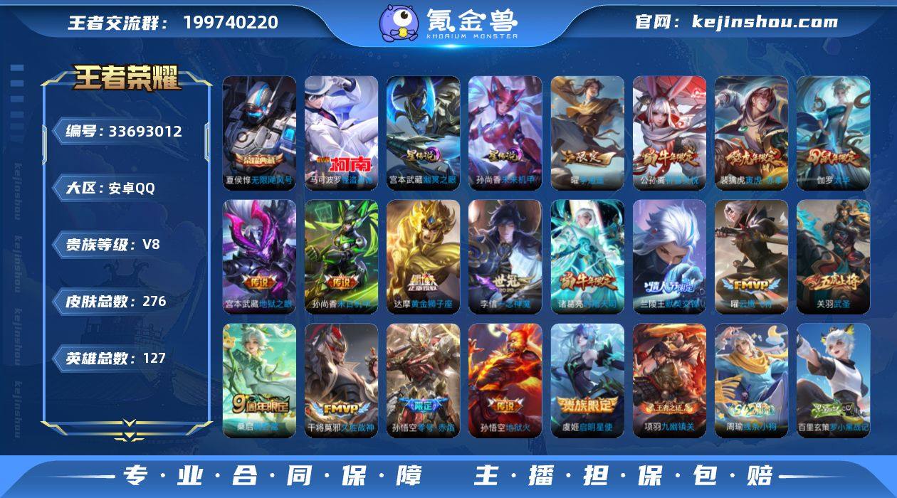 安卓Q-V6-永恒钻石I段位-127英雄-276皮肤-1典藏皮肤-1珍品传说-17传说-75史诗 【英雄全皮】:孙权全皮,狂铁全皮,猪八戒全皮 【荣耀典藏】:夏侯惇无限飓风号 【珍品传说】:马可波罗怪盗基德 【传说皮肤】:桑启鸣野蒿,裴擒虎寅虎赤拳,曜李逍遥 ,兰陵王默契交锋,公孙离祈雪灵祝,诸葛亮时雨天司,虞姬启明星使,孙悟空零号赤焰,关羽武圣,曜云鹰飞将,李信一念神魔,伽罗太华,干将莫邪久胜战神,达摩黄金狮子座,孙尚香末日机甲,宫本武藏地狱之眼,孙悟空地狱火 【限定皮肤】:白起狰,蔡文姬夏日便利店,虞姬夏日便利店,姜子牙天穹之誓,狄仁杰阴阳师,赵云皇家上将,赵云龙胆,墨子神迹守卫,孙尚香蔷薇恋人,庄周高山流水,高渐离死亡摇滚,白起夜都怪侠,芈月重明,吕布御风骁将,元歌云间偶戏,元歌无心,甄姬游园惊梦,曹操烛龙,典韦穷奇,马可波罗暗影游猎,狄仁杰魔术师,狄仁杰万华元夜,达摩沙漠行僧,项羽海滩派对,老夫子醍醐杖,老夫子航海奇遇记,关羽冰锋战神,关羽武圣,程咬金演武夺筹,王昭君午后时光,兰陵王默契交锋,兰陵王金庭之子,花木兰默契交锋,亚瑟潮玩骑士王,孙悟空至尊宝,孙悟空零号赤焰,牛魔御旌,牛魔奔雷神使,李元芳银河之约...