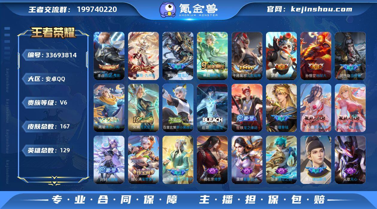 【WBOGP4541】 典藏1 传说6 史诗50 限定57 英雄129 皮肤167 稀有英雄10 贵族0级 总场次2854 皮肤价值:126408 可排位 【荣耀典藏1】 李白鸣剑曳影 【限定传说3】 桑启鸣野蒿 夏侯惇霜北刀 澜愿照九州拓 【传说皮肤6】 干将莫邪久胜战神 孙悟空地狱火 桑启鸣野蒿 梦奇胖达荣荣 夏侯惇霜北刀 澜愿照九州拓 【年限皮肤1】 澜愿照九州拓 【珍宝阁皮肤2】 孙尚香蔷薇恋人 姬小满妄想食味 【限定史诗24】 明世隐百晓客 百里玄策罗小黑战记 女娲万灵启世 孙尚香蔷薇恋人 后羿石田雨龙 李白谪仙醉月 亚连破空之剑 狄仁杰魔术师 弈星炽弈燎原 少司缘涂山红红 大司命东方月初 赵云皇家上将 蒙犽顽岩魄 蔡文姬夏日便利店 暃埋骨钱 鲁班七号狮舞东方 镜青焰无极 姬小满妄想食味 元歌无心 鬼谷子五谷丰年 阿轲化蝶舞 赵怀真器灵浮梦炉 狂铁龙之律动 孙膑茶境仙 【限定皮肤57】 明世隐百晓客 百里玄策罗小黑战记 妲己线条小狗 桑启线条小狗 亚瑟荣光之誓 女娲万灵启世 孙尚香蔷薇恋人 艾琳鹤鸣心笺 甄姬逆浪荇歌 白起死霸装 后羿石田雨龙 姬小满小满鸭