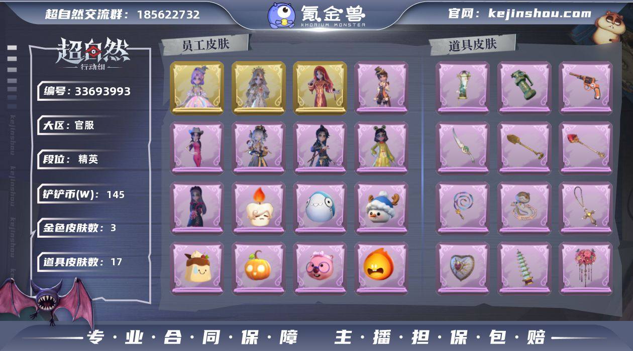 金色皮肤数量: 3 紫色皮肤数量: 6 道具皮肤数量: 17 段位: 精英 员工: 逍遥,薇薇安,巫铃儿,莉莉,阿念,艾伦,小黄,零,爱丽丝,爱德华,兰,小满,临云 外观: 遗失的童话,圣光之谕,镜花辞,丝缕哀歌,嘻嘻头套,烈焰红唇头套,呆滞头套,炙热烧烤,卑微头套,哈士奇头套,滑稽头套,鱼头怪头套,面具马头套,萨卡班甲鱼头套,咬咬鲨头套,小狗蛇点点头套,天使的呼唤,蝶恋花,未竟乐园,天使消失的年代,钗头凤,呱呱雨衣,绣春逍影,绒团小狐狸,除妖小师妹,小财神豚豚头套,火爆了头套,精致露比头套,惊魂南瓜,糖果守卫,樱桃奶油布丁,雪墩墩头套,太空鲨头套,耀眼的你,庆宴绮愿,烛光纪念,拂云仙,牛啤背包,夜浮船