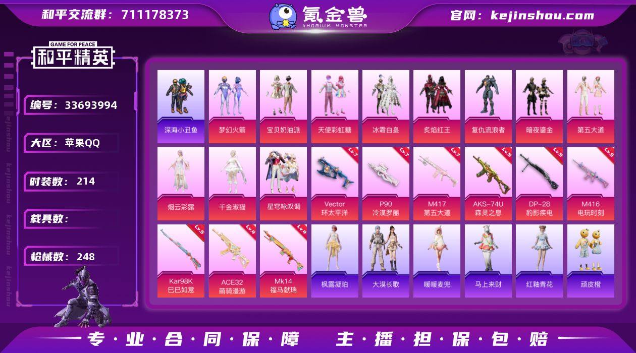 苹果 手Q-11粉装-9特效枪-0载具-4粉色飞行器-78752热力值-15王牌印记-214套装-248枪皮 【热门品类】:粉装-梦幻火箭,套装-浪漫天命,套装-深海小丑鱼,套装-小丑鱼,角色-军刀雅典娜,套装-龟仙人,套装-潮萌小黄鸭,套装-暗影哥特,套装-糯粉咩咩,角色-Mark.06,熔岩游骑兵连帽夹克 【粉色套装】:粉装-宝贝奶油派,粉装-天使彩虹糖,粉装-梦幻火箭,粉装-冰霜白皇,粉装-炙焰红王,角色-复仇流浪者,粉装-暗夜鎏金,粉装-第五大道,角色-烟云彩露,角色-千金淑猫,粉装-星穹咏叹调 【粉色枪皮等级】:M416-电玩时刻(五级),ACE32-萌骑漫游(四级),Vector-环太平洋(七级),AKS-74U-森灵之息(五级),P90-冷漠罗丽(七级),Kar98K-巳巳如意(五级),Mk14-福马献瑞(四级),M417-第五大道(七级),DP-28-豹影疾电(五级) 【粉色枪皮】:M416-电玩时刻,ACE32-萌骑漫游,Vector-环太平洋,AKS-74U-森灵之息,P90-冷漠罗丽,Kar98K-巳巳如意,Mk14-福马献瑞,M417-第五大道,DP-28-豹影疾电 【粉色飞行器】:绝对恒星飞行器,炫彩糖果飞行器,太空嘟嘟飞行器,BEARBRICK飞行器 【粉色降落伞】:绝对恒星降落伞,甜心宝贝降落伞,梦幻火箭降落伞,甜蜜誓约降落伞,童趣迷兔降落伞,环...