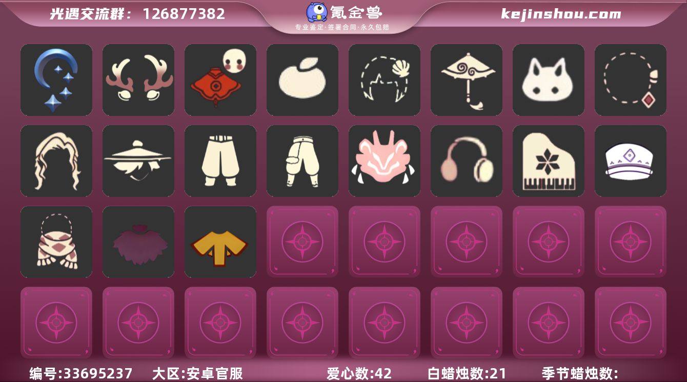 账号类型: 邮箱账号 季节已毕业: 夜行季 完成地图: 晨岛,雨林,霞谷,暮土 礼包: 鹿角,福娃,橘子,贝壳,红伞,兔子,彩虹耳钉 裤子: 武士裤,搓澡巾 面具: 夜行毕业面具 面饰: 红耳机 项链: 围巾 发型: 若笠,虚荣 头饰: 平顶帽 斗篷: 黄色蓑衣,粉红绒毛斗篷 配饰: 高音钢琴 亮点: 【优质装备】:晨岛,雨林,霞谷,墓土(暮土),若笠(箬笠),武士裤,高音钢琴(白色高脚钢琴),夜行季,围巾(肩带),夜行毕业面具(棕熊面具),粉红绒毛斗篷(绒毛斗篷),福娃(福娃礼包)(春之日礼包)(铜钱斗),红耳机,鹿角(圣诞鹿角),红伞(瑞气纸伞),兔子(玉兔头饰)(玉兔发饰)(兔子发饰),彩虹耳钉(彩虹耳饰),橘子(大橘大利),贝壳(贝壳发饰)