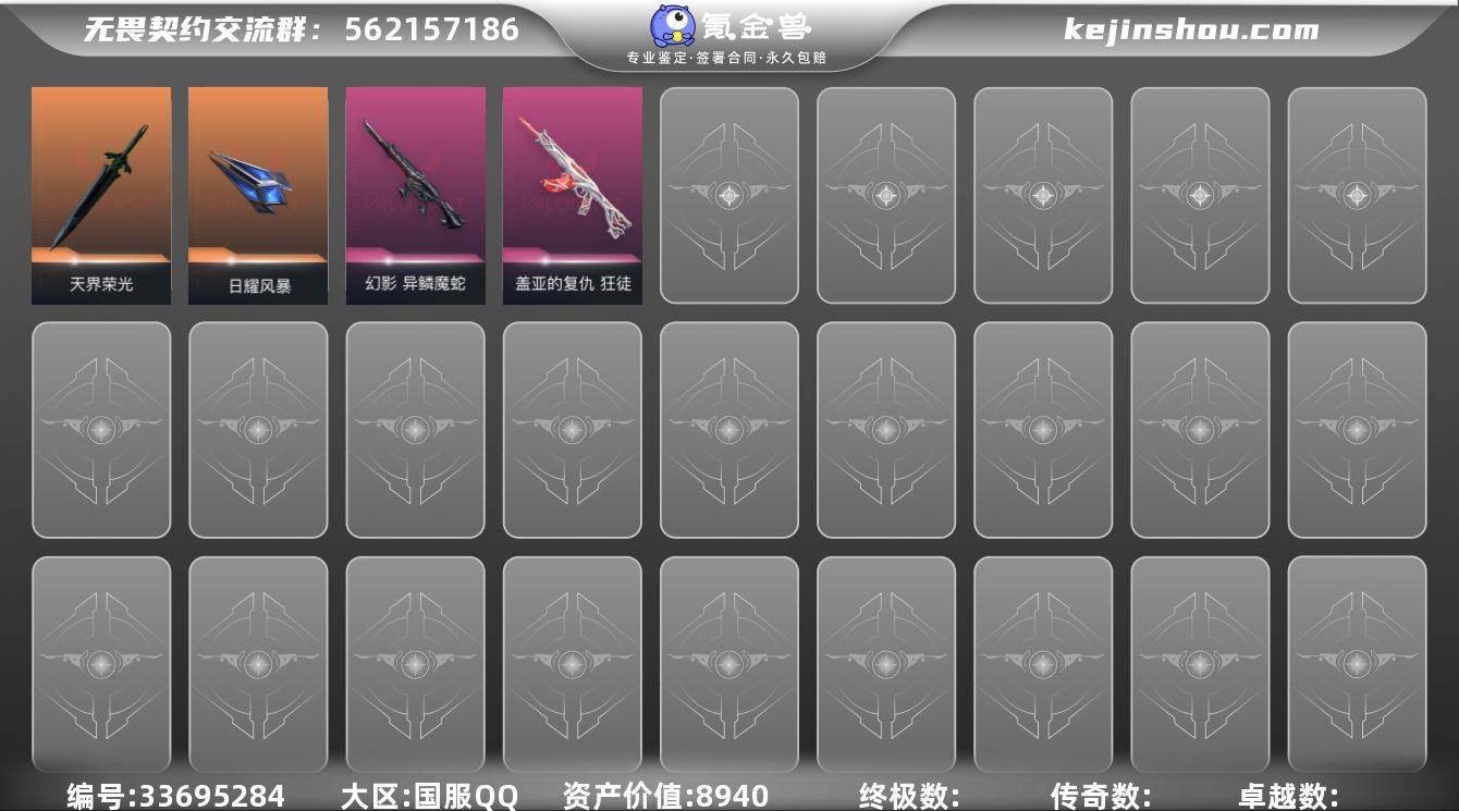 57002|【可实名】可二次 青铜II 皮肤价值8940 已用晶源225 皮肤数量9 套装数量1 限定2 卓越2 奢华4 精选1【拥有套装】VCT 2026 赛季 礼包【拥有皮肤】VCT 2026 篆刀,天界荣光,异鳞魔蛇 幻影,青铜II 皮肤价值8940 已用晶源225 皮肤数量9 套装数量1 限定2 卓越2 奢华4 精选1【拥有套装】VCT 2026 赛季 礼包【拥有皮肤】VCT 2026 篆刀,天界荣光,异鳞魔蛇 幻影,盖亚的复仇 狂徒,日耀风暴 正义,星际猎兵 标配,幻心猎手 鬼魅,蒙太奇 狂怒,游戏结束 正义 英雄数量10 卡面数量44 喷漆数量27 挂饰数量25【拥有卡面】战术特工 卡面,5周年:超能力 卡面,画笔战术 卡面,终章:将军协议 卡面,能量增幅 卡面,星宿灿烂:猎枭 卡面,情人节:猎枭 卡面,VCT 2026 CN联赛 卡面,VCT 2026 美洲联赛 卡面,VCT 2026 太平洋联赛 卡面,VCT 2026 EMEA联赛 卡面,剧毒之传 卡面,追猎设计图 卡面 ,维特鲁威皮蛋 卡面,三重威胁 卡面,V25:巴黎序曲 卡面,尽情舞动 卡面,5周年:为何而战 卡面,无畏契约GO!第一卷:零 卡面,无畏契约GO!第一卷:芮娜 卡面,禁灭工牌 卡面,刀锋镜影 卡面,终章:TB-01 战术巨熊 卡面,触不可及 卡面,再火一回 卡面,身陷蝰腹 卡面,5周年:掌控全局 卡面,大军“鸭”境 卡面,峡谷骑手 卡...