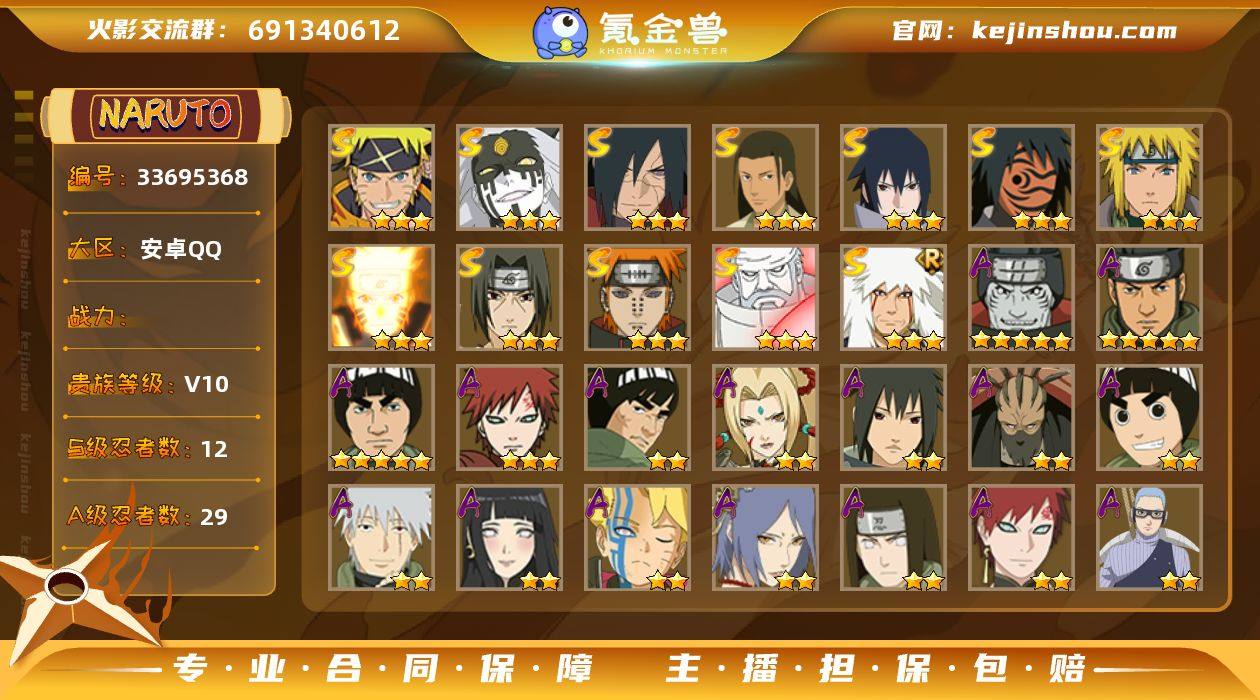 【编号16657 可秒换绑】【店长推荐!极品小号!永恒佐助 创立柱间 漂泊小南 !! !!】 12S级忍者数-29A级忍者数 【S级忍者】:宇智波斑「秽土转生·解」(3星),宇智波鼬「须佐能乎」(3星),千手柱间「木叶创立」(3星),自来也「舞之豪杰」(3星),波风水门(3星),神秘面具男「红夜之刃」(3星),漩涡鸣人「九喇嘛连结」(3星),佩恩「天道」(3星),宇智波佐助「永恒万花筒」(3星),大筒木金式(3星),大筒木桃式(3星),漩涡鸣人·宇智波佐助(3星) 【A级忍者】:艾「青年」(2星),长门「青年」(2星),波风水门「青年」(2星),迪达拉(2星),奇拉比(2星),飞段(2星),飞段「死司凭血」(2星),干柿鬼鲛(5星),漩涡博人「桃式显现」(2星),迈特凯(5星),旗木卡卡西「幻之真容」(2星),我爱罗「疾风传」(3星),我爱罗「新春限定」(2星),蝎(2星),蝎「绯流琥」(2星),小南「漂泊浪客」(2星),猿飞阿斯玛(5星),宇智波鼬(2星),宇智波佐助「须佐能乎」(2星),日向宁次「忍界大战」(2星),日向雏田「最终章」(2星),长十郎「六代目水影」(2星),卑留呼「火之意志继承者」(2星),李洛克「忍界大战」(2星),黑土「博人传」(2星),千代「近松十人卫」(2星),宇智波泉奈(2星),纲手「妖怪...