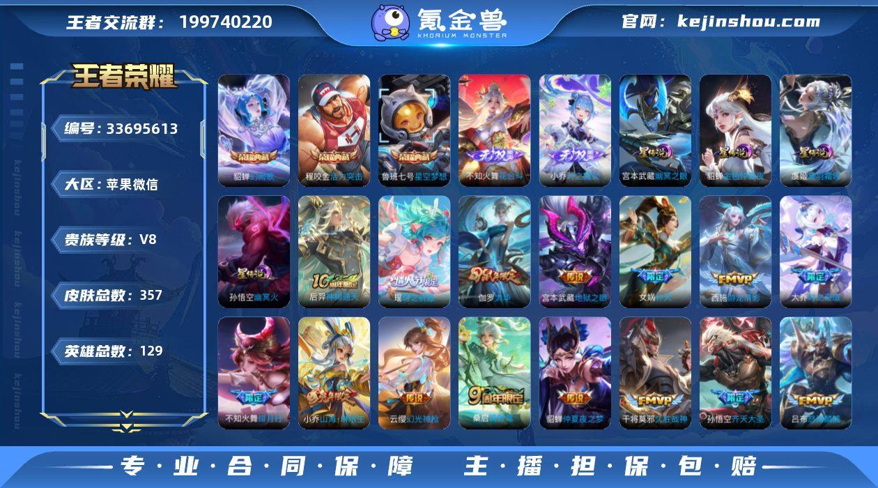 苹果WX-V8-至尊星耀III段位-129英雄-357皮肤-3典藏皮肤-2无双-17金标-27传说-115史诗 【英雄全皮】:不知火舞全皮,敖隐全皮,影全皮,少司缘全皮 【荣耀典藏】:鲁班七号星空梦想,程咬金活力突击,貂蝉幻阙歌 【无双皮肤】:不知火舞花合斗,小乔时之魔女 【传说皮肤】:后羿神树通天,云缨幻光神枪,桑启鸣野蒿,大乔时之奇旅,上官婉儿妄想奇谈,孙悟空齐天大圣,小乔山海琳琅生,吕布怒海麟威,不知火舞绯月行,女娲补天,瑶时之祈愿,赵云淬星耀世,王昭君乞巧织情,西施游龙清影,李元芳飞鸢探春,铠绛天战甲,虞姬启明星使,伽罗太华,貂蝉猫影幻舞,张良黄金白羊座,干将莫邪久胜战神,虞姬云霓雀翎,花木兰冠军飞将,貂蝉仲夏夜之梦,宫本武藏地狱之眼,孙悟空地狱火,武则天海洋之心 【限定皮肤】:姜子牙天穹之誓,狄仁杰阴阳师,小乔山海琳琅生,赵云皇家上将,墨子神迹守卫,妲己时之彼端,嬴政白昼王子,孙尚香蔷薇恋人,鲁班七号狮舞东方,庄周高山流水,高渐离死亡摇滚,阿轲迷踪丽影,钟无艳王者之锤,白起夜都怪侠,芈月幻夜卜梦,吕布猎兽之王,周瑜赤莲之焰,元歌无心,夏侯惇朔风刀,甄姬幽恒,甄姬游园惊梦,曹操天狼征服者,典韦蓝屏警告,马可波罗逐...