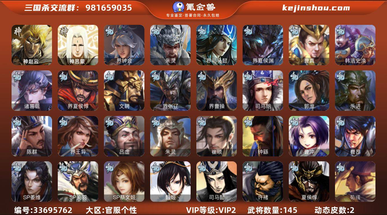 VIP等级: VIP2 官阶: 先锋将军 武将数量: 145 动态皮肤数量: 2 神将: 神赵云,神吕蒙 魏国武将: 界钟会,张辽,SP蔡文姬,SP关羽,SP姜维,曹昂,曹操,曹冲,曹洪,曹丕,曹仁,王异,界曹植,荀攸,钟繇,郭嘉,荀彧,崔琰,朱灵,吕虔,界王异,陈群,乐进,郭淮,夏侯惇,司马朗,界曹操,许褚,界张辽,文聘,曹彰,界夏侯惇,诸葛诞,司马懿,甄姬,韩浩史涣,曹真,界夏侯渊,夏侯渊,于禁,邓艾,界司马懿,朱灵(国战) 蜀国武将: 谯周,界张嶷,赵云,张松,刘封,黄月英,关羽,吴懿,祝融,张飞,魏延,刘禅,关银屏,SP徐庶,周仓,简雍,界关兴张苞,诸葛亮,界马岱,关平,马岱,庞统,马超,廖化,关兴张苞,孟获,黄忠,刘备,界马超,马良,甘夫人,SP甘夫人,势魏延,势陈到 吴国武将: 潘濬,周泰,吕蒙,顾雍,孙亮,界朱治,祖茂,孙尚香,程普,大乔,韩当,陆逊,虞翻,孙鲁班,界周瑜,孙权,界甘宁,甘宁,界大乔,孙坚,孙鲁育,凌统,周瑜,小乔,黄盖,界陆逊,谋韩当,徐盛,张昭张纮,孙邵,朱桓 群国武将: 伏完,华雄,袁术,高顺,于吉,界公孙瓒,吕布,李儒,公孙瓒,王濬,蔡夫人,星张郃,潘凤,界袁术,SP马超,界华佗,贾诩,庞德,张宝,荀谌,鲍信,董卓,张角,袁绍,华佗,貂蝉,伏皇后,界吕布,公孙渊,颜良文丑,邹氏,贾充,马腾,势田丰