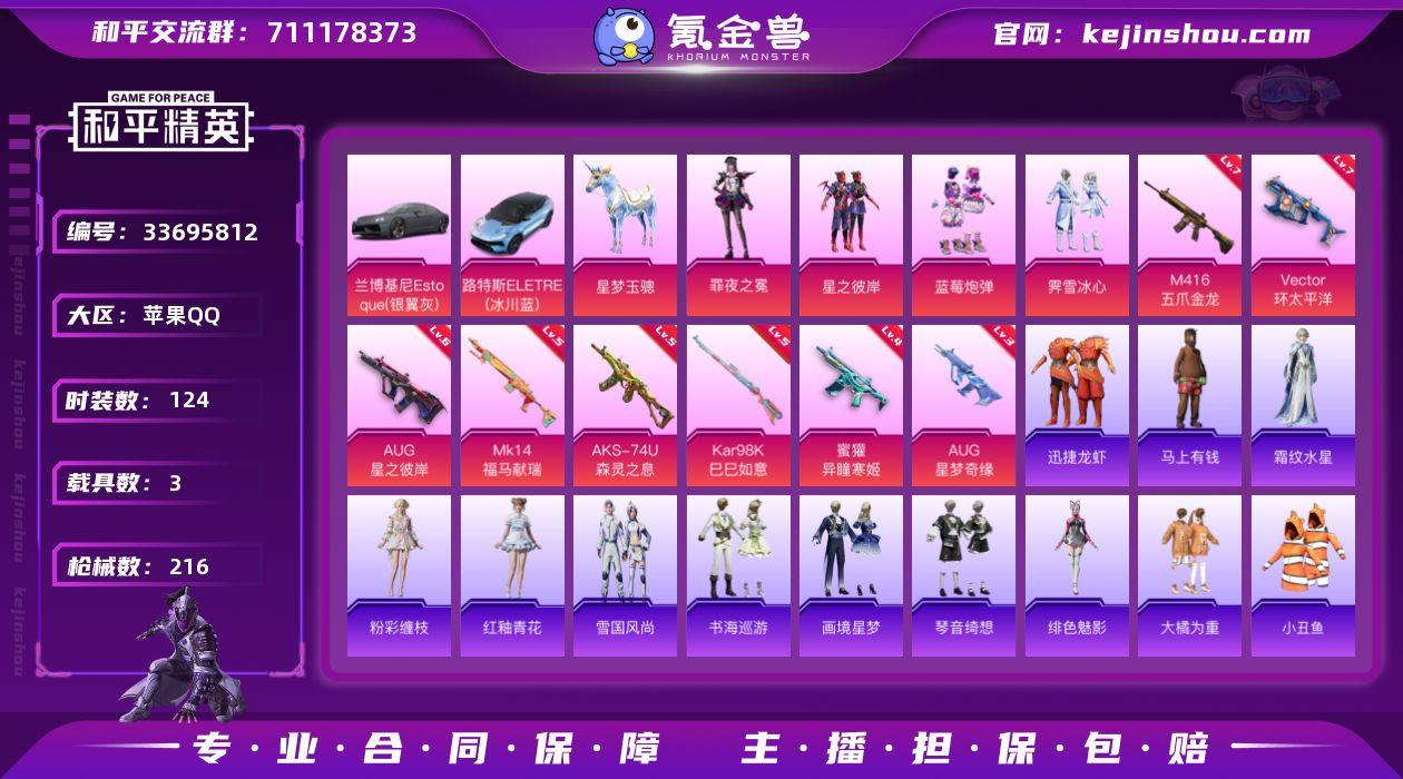 苹果 手Q-4粉装-8特效枪-3载具-3粉色飞行器-70635热力值-6王牌印记-124套装-216枪皮 【热门品类】:套装-小丑鱼,角色-军刀雅典娜,套装-粉红小猪 【粉色套装】:粉装-星之彼岸,粉装-蓝莓炮弹,粉装-霁雪冰心,角色-罪夜之冕 【粉色枪皮等级】:M416-五爪金龙(七级),AUG-星之彼岸(六级),AUG-星梦奇缘(三级),蜜獾-异瞳寒姬(四级),Vector-环太平洋(七级),AKS-74U-森灵之息(五级),Kar98K-巳巳如意(五级),Mk14-福马献瑞(五级) 【粉色载具】:兰博基尼Estoque(银翼灰),路特斯ELETRE(冰川蓝),星梦玉骢 【粉色枪皮】:M416-五爪金龙,AUG-星之彼岸,AUG-星梦奇缘,蜜獾-异瞳寒姬,Vector-环太平洋,AKS-74U-森灵之息,Kar98K-巳巳如意,Mk14-福马献瑞 【粉色飞行器】:炫彩糖果飞行器,星之彼岸飞行器,齐天大圣飞行器 【粉色降落伞】:凝视深渊降落伞,星之彼岸降落伞,暗夜玫瑰降落伞,洛神天依降落伞,碧影闪光降落伞,筑梦精灵降落伞,闪光银龙降落伞,环太平洋降落伞,彩虹甜喵降落伞,旋转彩虹降落伞,星梦奇缘降落伞,异瞳寒姬降落伞,极意拳锋降落伞,炫彩糖果降落伞,镜花水月降落伞 【稀有套装】:套装-巳巳如意,套装-雪国风尚,套装-炫彩糖果,套装-马上有...