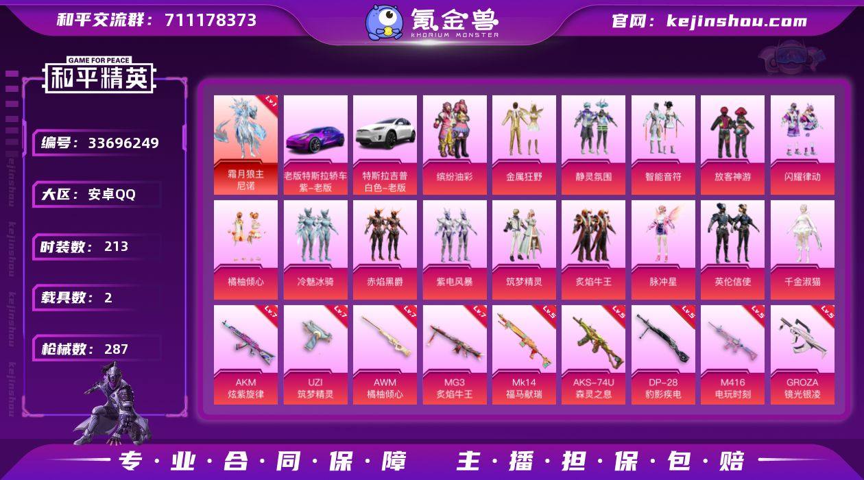 213套装/枪械16/装备369/载具2/战备184/王牌印记12/热力值98998/三级UMP45-霜月狼主/七级AKM-炫紫旋律/五级M416-电玩时刻/五级GROZA-镜光银凌/二级ACE32-萌骑漫游/七级UZI-筑梦精灵/三级UMP45-萌骑冒险/五级AKS-74U-森灵之息/五级Kar98K-巳巳如意/七级AWM-橘柚倾心/五级MK14-福马献瑞/二级AA12-G-萌骑幻想/五级DP-28-豹影疾电/二级DP-28-鸢尾珑雾/七级MG3-炙焰牛王/二级PKM-萌骑夺宝/一级霜月狼主-尼诺/霜月狼主-尼诺/缤纷油彩/浪漫天命/潮萌小黄鸭/暗影哥特/浪漫波比/粉红小猪/Mark.06/金属狂野/静灵氛围/智能音符/放客神游/闪耀律动/橘柚倾心/冷魅冰骑/赤焰黑爵/紫电风暴/筑梦精灵/炙焰牛王/脉冲星/英伦信使/千金淑猫/特斯拉Model 3(奇幻紫)/特斯拉Model X(珍珠白)/AKM炫紫旋律/M416电玩时刻/GROZA-镜光银凌/ACE32-萌骑漫游/UZI筑梦精灵/UMP45-萌骑冒险/UMP45-霜月狼主/AKS-74U-森灵之息/Kar98K-巳巳如意/AWM橘柚倾心/MK14-福马献瑞/AA12-G-萌骑幻想/DP-28-豹影疾电/DP-28-鸢尾珑雾/MG3炙焰牛王/PKM-萌骑夺宝/炫彩糖果飞行器/梦幻火箭飞行器/飞行器-炫紫旋律/飞行器-庄周梦蝶/飞行器-冷魅冰骑/幽焰列车飞行器/冰狼掠影飞行器/炫紫旋律降落伞/神秘黑猫降落伞/古堡领主降落伞/...