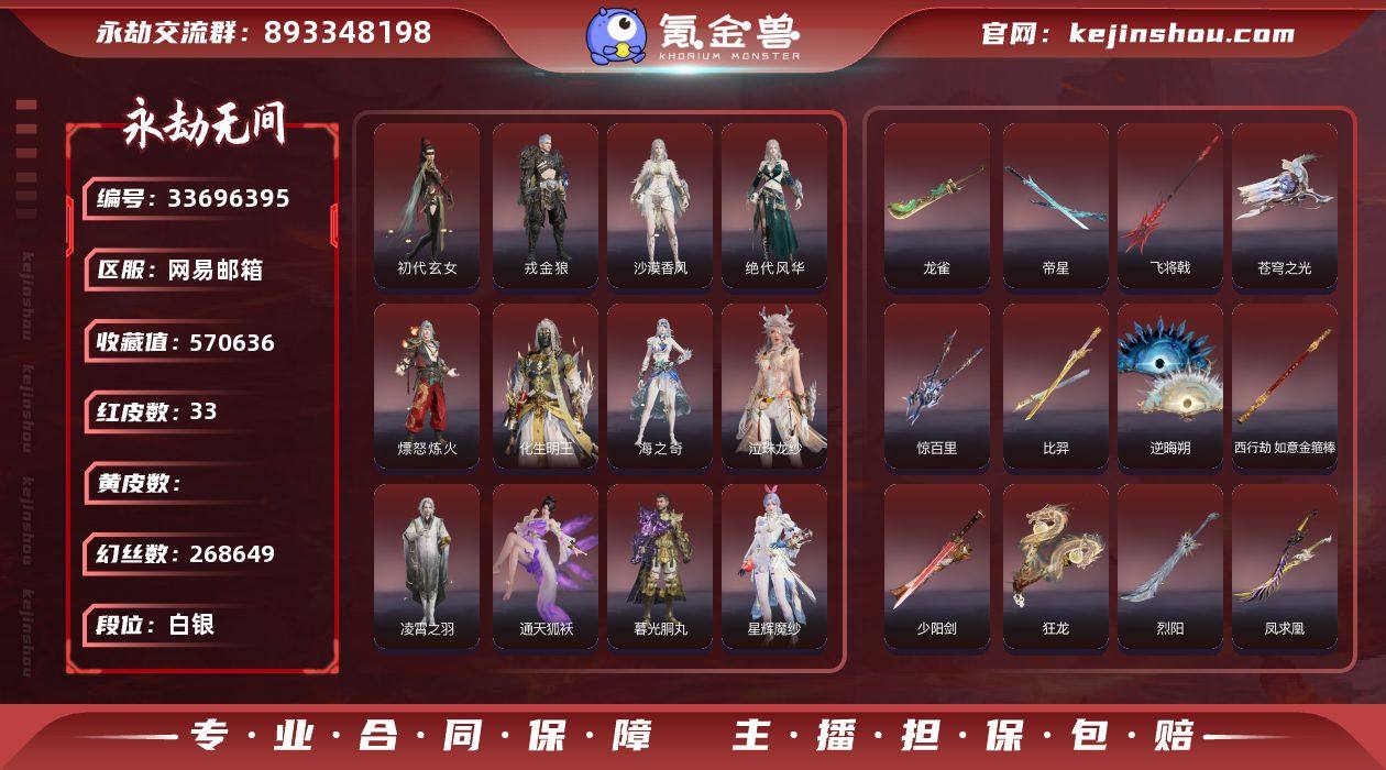 【红皮】:墨离(飞索皮肤),初代玄女(宁红叶皮肤),戎金狼(特木尔皮肤),绝代风华(迦南皮肤),沙漠香风(迦南皮肤),熛怒炼火(季沧海皮肤),海之奇(崔三娘皮肤),凌霄之羽(无尘皮肤),灵狐幻刃(太刀皮肤),狼主(阔刀皮肤),灵犀(长枪皮肤),暮光胴丸(武田信忠皮肤),凤求凰(双刀皮肤),烈阳(阔刀皮肤),少阳剑(长剑皮肤),狂龙(双节棍皮肤),化生明王(天海皮肤),泣珠龙纱(崔三娘皮肤),夜魅游莹(季莹莹皮肤),西行劫·如意金箍棒(棍皮肤),通天狐袄(玉玲珑皮肤),逆晦朔(扇皮肤),飞将戟(斩马刀皮肤),监兵凶神(胡为皮肤),比羿(横刀皮肤),执明神君(魏轻皮肤),惊百里(双戟皮肤),星辉魔纱(沈妙皮肤),苍穹之光(五眼铳皮肤),帝星(横刀皮肤),龙雀(阔刀皮肤) 【外观总数】33红 879 金 幻丝:金砖: 收藏值:57w 【段位】:单排: 双排: 三排: 【换绑】:5/20 可换绑,期间登录网易大神不影响正常游戏,其他皮肤可参考以下截图,道具、段位以实际验号为准,段位因赛季原因发生变化,以上号为准"