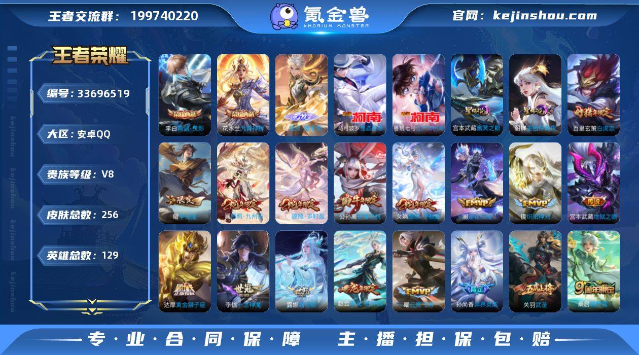 星元幽冥之眼,金色仲夏夜,安卓Q-V8-至尊星耀V段位-129英雄-256皮肤-2典藏皮肤-1无双-2珍品传说-24传说-78史诗 【英雄全皮】:孙权全皮,敖隐全皮 【荣耀典藏】:李白鸣剑曳影,花木兰九霄神辉 【无双皮肤】:曜器灵螭龙剑 【珍品传说】:鲁班七号江户川柯南,马可波罗怪盗基德 【传说皮肤】:女娲愿照千秋盛,澜愿照九州拓,虞姬愿照岁时盈,桑启鸣野蒿,赵云乘龙铭钟鼎,澜逐花归海,露娜霜月吟,李白诗剑行,孙尚香异界灵契,曜李逍遥 ,公孙离祈雪灵祝,镜炽阳神光,虞姬启明星使,关羽武圣,曜云鹰飞将,李信一念神魔,干将莫邪久胜战神,达摩黄金狮子座,百里玄策白虎志,花木兰冠军飞将,貂蝉仲夏夜之梦,宫本武藏地狱之眼,孙悟空地狱火,狄仁杰超时空战士 【限定皮肤】:狄仁杰阴阳师,赵云皇家上将,墨子神迹守卫,嬴政优雅恋人,孙尚香异界灵契,鲁班七号狮舞东方,庄周高山流水,高渐离死亡摇滚,钟无艳王者之锤,扁鹊奇幻香踪,芈月白晶晶,芈月幻夜卜梦,元歌云间偶戏,马可波罗暗影游猎,狄仁杰魔术师,狄仁杰万华元夜,达摩星际陆战队,达摩沙漠行僧,项羽海滩派对,老夫子醍醐杖,老夫子航海奇遇记,关羽武圣,程咬金演武夺筹,韩信傲雪梅枪,兰陵王金庭之...