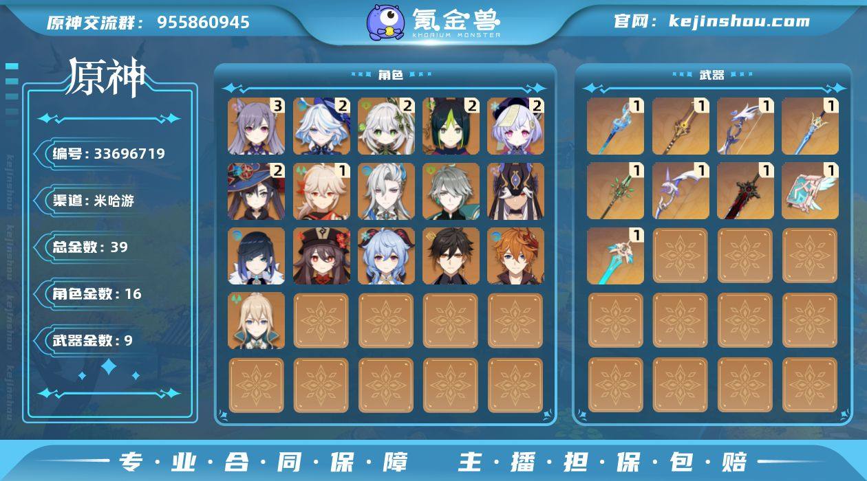 【店主推荐捡漏号】60级/39黄/女主/16个五星角色/9个五星武器 2命芙宁娜,0命那维莱特,0命艾尔海森,2命纳西妲,0命赛诺,2命提纳里,0命夜兰,1命枫原万叶,0命钟离,0命胡桃,0命甘雨,0命达达利亚,3命刻晴,2命七七,0命琴,2命莫娜,精1静水流涌之辉,精1赤沙之杖,精1若水,精1苍古自由之誓,精1和璞鸢,精1阿莫斯之弓,精1天空之刃,精1天空之卷,精1狼的末路