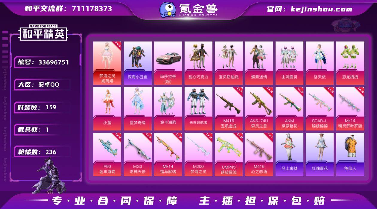 女生号 梦海之灵-妮芮妲(三级)-1神装-10粉装-11特效枪-1载具-4粉色飞行器-79593热力值-6王牌印记-159套装-236枪皮 QW25011211 【红色神装等级】:梦海之灵-妮芮妲(三级) 【红色角色神装】:梦海之灵-妮芮妲 【热门品类】:套装-深海小丑鱼,套装-龟仙人,角色-8号机 【粉色套装】:粉装-甜心巧克力,粉装-宝贝奶油派,粉装-蝶舞迷情,粉装-山涧鹿灵,角色-洛天依,粉装-恐龙拽拽,角色-小蓝,角色-星梦奇缘,粉装-金丰海韵,粉装-未来领航者 【粉色枪皮等级】:AKM-绿萝繁花(五级),SCAR-L-锦绣绵绵(五级),M416-五爪金龙(七级),M416-心之恋语(一级),UMP45-萌骑冒险(二级),AKS-74U-森灵之息(五级),P90-金丰海韵(四级),Mk14-精灵梦叶罗丽(五级),Mk14-福马献瑞(三级),M200-梦海之灵(三级),MG3-洛神天依(四级) 【粉色载具】:玛莎拉蒂Ghibli(粉) 【粉色枪皮】:AKM-绿萝繁花,SCAR-L-锦绣绵绵,M416-五爪金龙,M416-心之恋语,UMP45-萌骑冒险,AKS-74U-森灵之息,P90-金丰海韵,Mk14-精灵梦叶罗丽,Mk14-福马献瑞,M200-梦海之灵,MG3-洛神天依 【粉色飞行器】:心之恋语飞行翼,齐天大圣飞行器,幻海精灵飞行器 【粉色降落伞】:甜心宝贝降落伞,华贵君王降落伞,神秘...