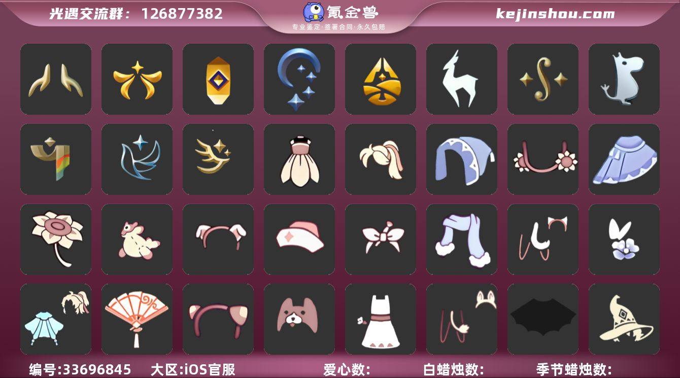 账号类型: 手机账号 季节已毕业: 欧若拉季,夜行季,追忆季,归巢季,九色鹿季,二重奏季,姆明季,彩染季,青鸟季,迁徙季,织光季 完成地图: 晨岛,云野,雨林,霞谷,暮土,禁阁,全图毕业 礼包: 蝙蝠套,巫师,荷叶伞,兔子鞋,茶桌,餐桌,兔子,南瓜,枯角,星月头饰,蝴蝶结,奥利奥,四叶草,小提琴,新年耳钉,日光耳环,满月耳坠,锦标赛桂冠,姆明饰品套装,向日葵连衣裙,献瑞折扇礼包,小狗周年发饰,粽子发饰礼包,青衫落拓礼包,蝴蝶与花发饰礼包,皮皮猫套装礼包,冬日围巾斗篷,蓝色守护帽礼包,绿茸茸卷耳发饰礼包,缀黄画笔发箍礼包,宝骏丹心马尾礼包,骐骥迎福礼包,金穗披肩斗篷礼包,鎏金魔法帽礼包,向日葵花瓣裙礼包,向阳花伞礼包,向日葵耳饰礼包 裤子: 武士裤