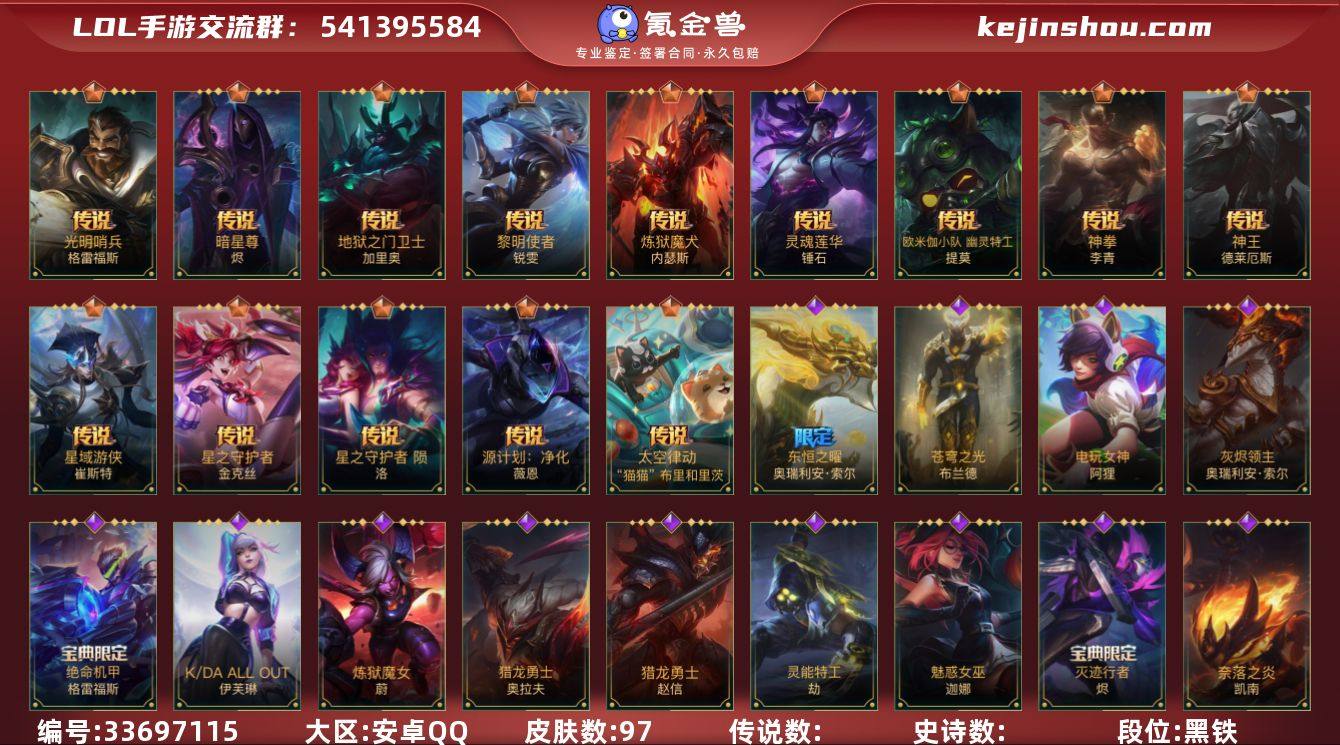 【LSQH37】103英雄/97皮肤/流光翡翠/源计划:净化/星之守护者金克丝/暗星尊/星域游侠卡牌/太空律动机器人/欧米伽小队 幽灵特工/星之守护者 陨/神拳盲僧/炼狱魔犬/神王诺手/光明哨兵格雷福斯/黎明使者锐雯/地狱之门卫士/灵魂莲华锤石/猎龙勇士赵信/清剿小队金克丝/源计划:升华/腥红之月烬/灭迹行者烬/灰烬领主/东恒之曜奥瑞利安索尔/K/DA ALL OUT寡妇/苹果机器人/星之守护者萨勒芬妮/源计划:风/电玩女神阿狸/幻梦甜心阿狸/源计划:阴/灵能特工劫/欧米伽小队 魔鬼伞兵/小蜜蜂提莫/炼狱魔女/奈落之炎/绝命机甲男枪/魅惑女巫风女/神龙尊者 苍龙/银河魔装机神小鱼人/虚空海灵/欧米伽小队 鬼影蛙人/源计划:雄心/睡衣守护者EZ/猎龙勇士奥拉夫/苍穹之光火男/鳄霸 雷克顿/s1光耀之刃/s2光耀之芒/s3光耀之灵/s4光耀之心/s5绯金魅影/s6绯金丽刃/s7绯金战斧/s8绯金鮫灵/s9王牌舰长/s10王牌上将/S11王牌勇将/s11王牌司令/s12龙冕先锋/s13龙冕御盾/s16冠翎飞行员/死亡骑士/三昧真火/光耀之心发条/国王/光耀之刃蛮王/龙冕先锋赵信/死亡绽放/光耀之芒金克丝/猎龙勇士布隆/龙冕御盾布隆/探戈灵魂崔斯特/王牌舰长/刀锋女王/探戈灵魂寡妇/绯金魅影(可升级)/钢铁意志/银色之牙/绯金丽刃(可升...