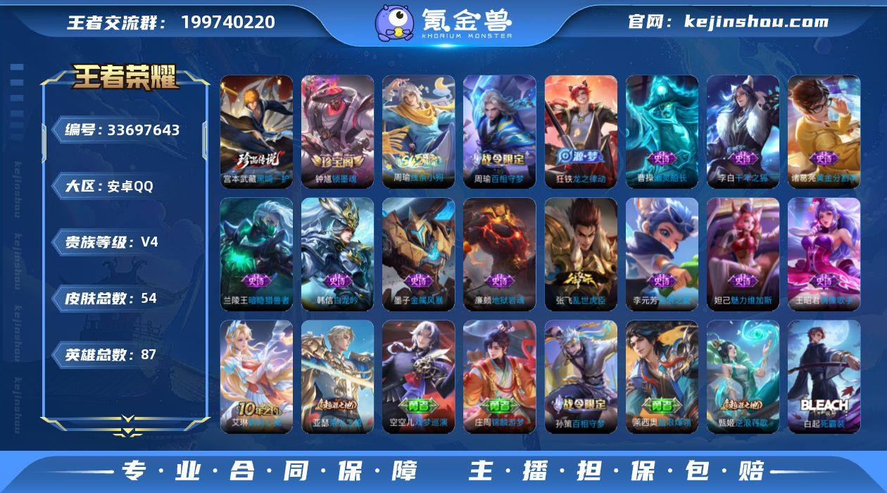 可换绑 1按键 4王者印记 无五级铭文 可二次安卓Q-V4-54皮肤-1珍品传说-14史诗【英雄全皮】:空空儿全皮【珍品传说】:宫本武藏黑崎一护【限定皮肤】:项羽海滩派对【赛季限定】:太乙真人谧流熔炉,钟馗虚灵犬护,甄姬逆浪荇歌,亚瑟荣光之誓【战令限定】:周瑜百相守梦,孙策百相守梦,周瑜线条小狗【史诗皮肤】:钟馗锁墨魂,周瑜线条小狗,周瑜百相守梦,狂铁龙之律动,李元芳逐浪之夏,诸葛亮黄金分割率,兰陵王暗隐猎兽者,韩信白龙吟,张飞乱世虎臣,李白千年之狐,曹操幽灵船长,墨子金属风暴,妲己魅力维加斯,廉颇地狱岩魂,王昭君偶像歌手【其他皮肤】:艾琳鹤鸣心笺,亚瑟荣光之誓,莱西奥踏浪烽翎,空空儿戏梦巡演,庄周锦麟游梦,孙策百相守梦,甄姬逆浪荇歌,白起死霸装,钟馗虚灵犬护,戈娅玫蓝誓约,明世隐景韶洛都,太乙真人谧流熔炉,盘古重装意志,吕布野性能量,鬼谷子幻乐之宴,李白敏锐之力,诸葛亮掌控之力,刘备汉昭烈帝,后羿阿尔法小队,宫本武藏万象初新,刘备万事如意,亚瑟死亡骑士,典韦黄金武士,白起白色死神,赵云忍炎影,阿轲爱心护理,韩信街头霸王,韩信教廷特使,项羽海滩派对,曜归虚梦演,李信灼热之刃,元歌午夜歌剧院,裴擒虎街头旋...