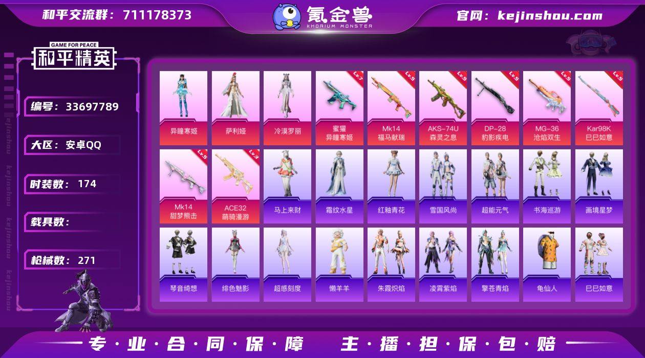 【kyhp1185】安卓 手Q-3粉装-8特效枪-0载具-2粉色飞行器-72063热力值-15王牌印记-174套装-271枪皮 【热门品类】:套装-龟仙人 【粉色套装】:角色-萨利娅,角色-冷漠罗丽,角色-异瞳寒姬 【粉色枪皮等级】:蜜獾-异瞳寒姬(七级),ACE32-萌骑漫游(三级),AKS-74U-森灵之息(五级),Kar98K-巳巳如意(五级),Mk14-甜梦熊击(五级),Mk14-福马献瑞(五级),DP-28-豹影疾电(五级),MG-36-沧焰双生(五级) 【粉色枪皮】:蜜獾-异瞳寒姬,ACE32-萌骑漫游,AKS-74U-森灵之息,Kar98K-巳巳如意,Mk14-甜梦熊击,Mk14-福马献瑞,DP-28-豹影疾电,MG-36-沧焰双生 【粉色飞行器】:炫彩糖果飞行器,月下星之子飞行器 【粉色降落伞】:绝对恒星降落伞,星之彼岸降落伞,洛神天依降落伞,彩虹甜喵降落伞,守护天翼降落伞,未来领航者降落伞,彩虹独角兽降落伞,喜羊羊与灰太狼降落伞,异瞳寒姬降落伞,炫彩糖果降落伞 【稀有套装】:套装-龟仙人,套装-巳巳如意,套装-超能元气,角色-超感刻度,套装-雪国风尚,套装-炫彩糖果,套装-马上来财,套装-雏菊兔兔,套装-萝兰蝴蝶,角色-拉斐尔,套装-燕燕于飞,套装-鱼渊荷华,角色-糖霜甜心,套装-粉恋花,套装-紫幽梦,套装-蓝冰羽,套装-星渊小夜...