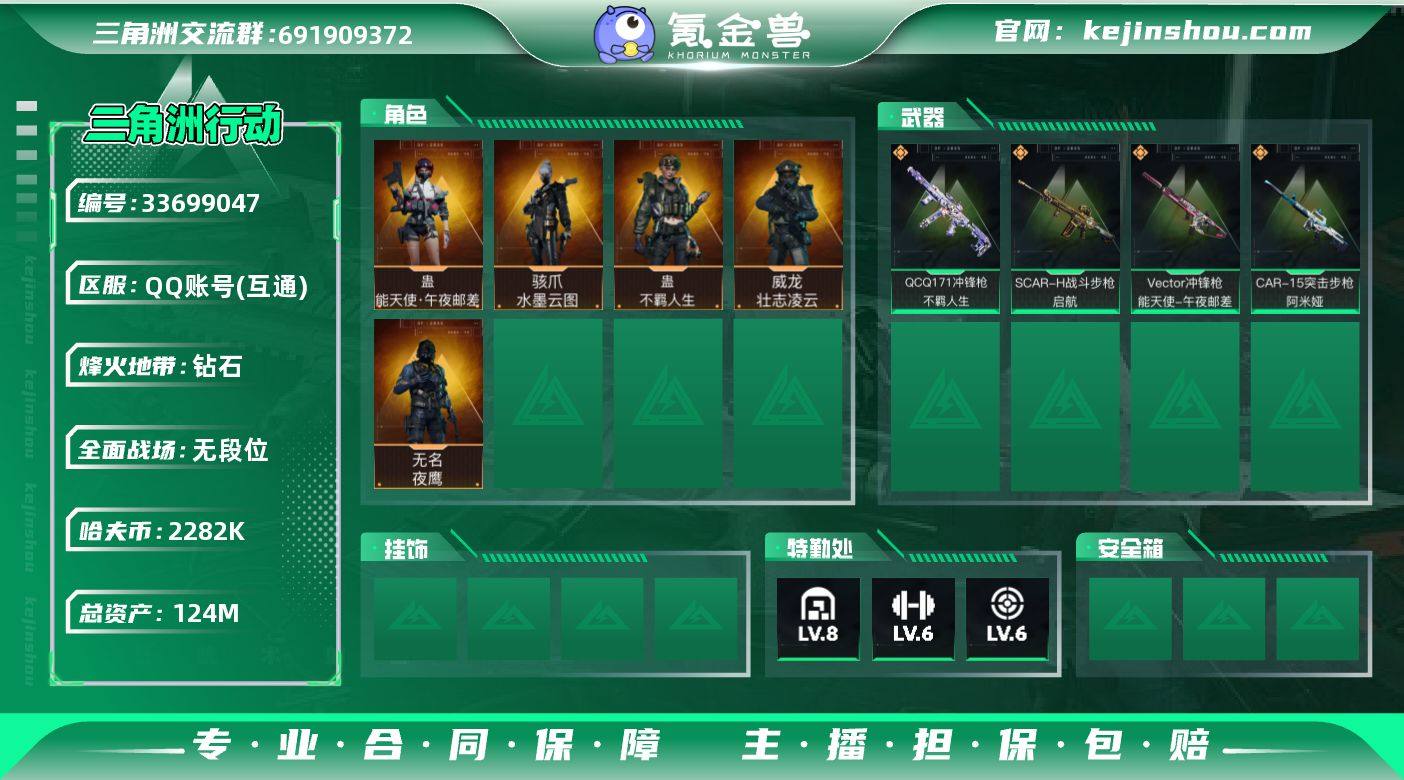 A12875/可二次/QQ区【总资产:124.1M+63发aw+近战影锋+骇爪水墨云图+蛊午夜邮差+威龙壮志凌云+仓库8+体力负重6+守信不渝】/烽火等级:60级/全面战场:50级/纯币:2282K/三角券加币:70(三角币49+三角券21)【近战-影锋】【骇爪-水墨云图/蛊-午夜邮差】无名-夜鹰/威龙-壮志凌云/蜂医-无题密令/蛊-不羁人生/部门:32332/特勤等级(技术中心3级/工作台3级/制药台3级/防具台3级/仓库8级/指挥中心6级/训练中心6级/靶场6级/潜水中心1级/收藏室1级)AK-12突击步枪-夜鹰/SCAR-H战斗步枪-启航/CAR-15突击步枪-阿米娅/Vector冲锋枪-能天使·午夜邮差/QCQ171冲锋枪-不羁人生/M1014弹枪-影锋/橙色挂饰x7/段位:钻石I(流动资产:94.2M)/详细看图 ,骇爪-水墨云图,蛊-能天使午夜邮差,威龙-壮志凌云,无名-夜鹰,蛊-不羁人生