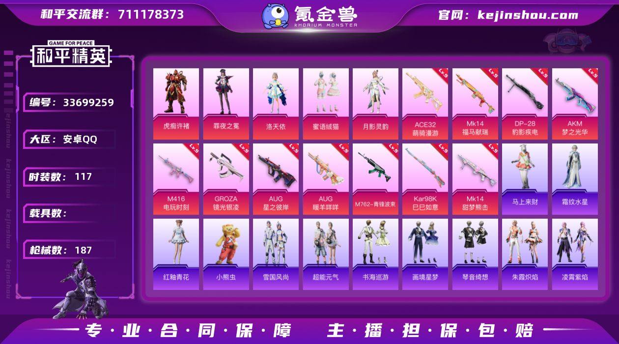 【kyhp1224】安卓 手Q-5粉装-11特效枪-0载具-3粉色飞行器-52777热力值-7王牌印记-117套装-187枪皮 【热门品类】:套装-龟仙人 【粉色套装】:角色-洛天依,粉装-蜜语绒猫,角色-月影灵韵,角色-罪夜之冕,角色-虎痴许褚 【粉色枪皮等级】:AKM-梦之光华(五级),M416-电玩时刻(五级),GROZA-镜光银凌(五级),AUG-星之彼岸(五级),AUG-暖羊咩咩(五级),M762-青锋波束(五级),ACE32-萌骑漫游(五级),Kar98K-巳巳如意(五级),Mk14-甜梦熊击(五级),Mk14-福马献瑞(五级),DP-28-豹影疾电(五级) 【粉色枪皮】:AKM-梦之光华,M416-电玩时刻,GROZA-镜光银凌,AUG-星之彼岸,AUG-暖羊咩咩,M762-青锋波束,ACE32-萌骑漫游,Kar98K-巳巳如意,Mk14-甜梦熊击,Mk14-福马献瑞,DP-28-豹影疾电 【粉色飞行器】:炫彩糖果飞行器,星之彼岸飞行器,云梦轻舟飞行器 【粉色降落伞】:绝对恒星降落伞,星之彼岸降落伞,洛神天依降落伞,炫光之旅降落伞,圣堂之誓降落伞,精灵梦叶罗丽降落伞,守护天翼降落伞,金丰海韵降落伞,脆鲨七海降落伞,月下星之子降落伞,星穹咏叹调降落伞,冷漠罗丽降落伞,异瞳寒姬降落伞,炫彩糖果降落伞,罪夜之冕降落伞 【稀有套装】:套装-龟仙人,套装-巳巳如意...