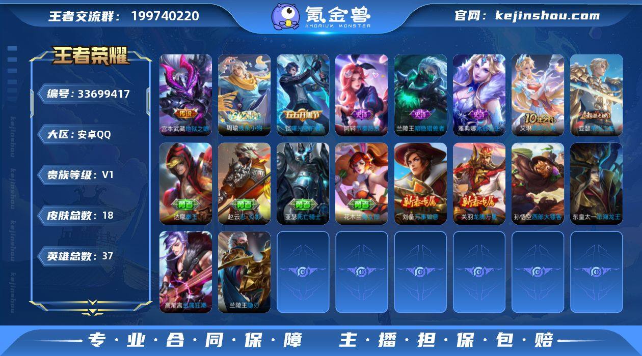 可换绑【特惠小号】 无王者印记 无五级铭文 可二次安卓Q-V0-18皮肤-1传说-4史诗【传说皮肤】:宫本武藏地狱之眼【赛季限定】:亚瑟荣光之誓【战令限定】:周瑜线条小狗【史诗皮肤】:周瑜线条小狗,阿轲节奏热浪,铠曙光守护者,雅典娜冰冠公主,兰陵王暗隐猎兽者【其他皮肤】:艾琳鹤鸣心笺,亚瑟荣光之誓,关羽龙腾万里,刘备万事如意,花木兰兔女郎,达摩拳王,亚瑟死亡骑士,赵云忍炎影,东皇太一东海龙王,兰陵王隐刃,孙悟空西部大镖客,高渐离金属狂潮