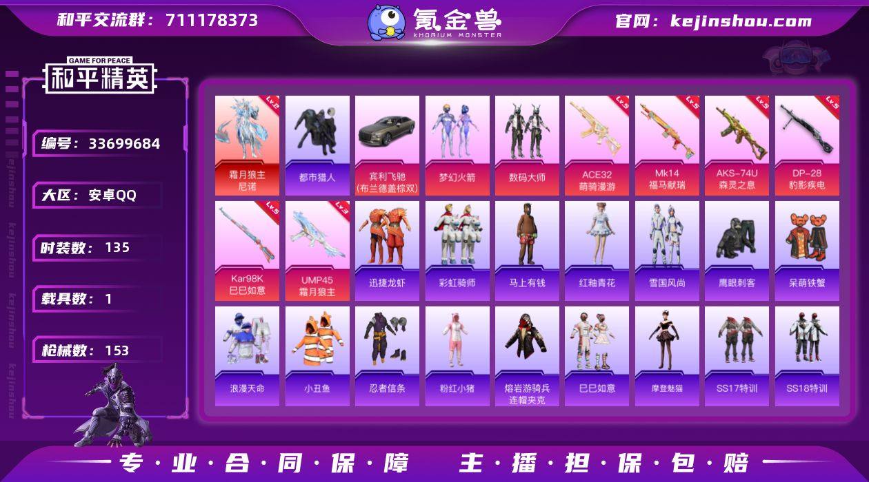 【店主推荐捡漏号】安卓 手Q-无敌战神框-1神装-2粉装-6特效枪-1载具-3粉色飞行器-49810热力值-10王牌印记-135套装-153枪皮【红色神装等级】:霜月狼主-尼诺(二级)【红色角色神装】:霜月狼主-尼诺【热门品类】:粉装-梦幻火箭,套装-浪漫天命,套装-都市猎人,套装-小丑鱼,套装-忍者信条,套装-粉红小猪,熔岩游骑兵连帽夹克【粉色套装】:粉装-数码大师,粉装-梦幻火箭【粉色枪皮等级】:UMP45-霜月狼主(三级),ACE32-萌骑漫游(五级),AKS-74U-森灵之息(五级),Kar98K-巳巳如意(五级),Mk14-福马献瑞(五级),DP-28-豹影疾电(五级)【粉色载具】:宾利飞驰(布罗德盖棕双色)【粉色枪皮】:ACE32-萌骑漫游,UMP45-霜月狼主,AKS-74U-森灵之息,Kar98K-巳巳如意,Mk14-福马献瑞,DP-28-豹影疾电