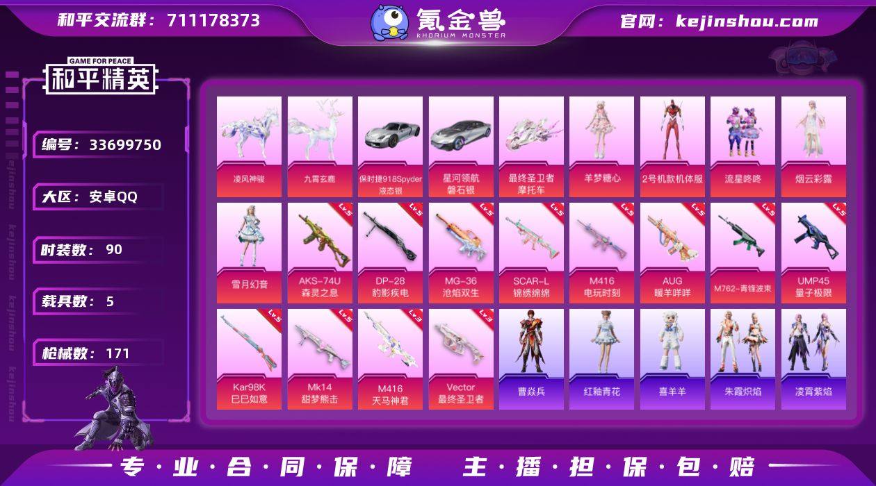安卓 手Q-5粉装-12特效枪-5载具-6粉色飞行器-61127热力值-4王牌印记-90套装-171枪皮 【热门品类】:套装-龟仙人,套装-粉红小猪 【粉色套装】:角色-2号机款机体服,粉装-流星咚咚,角色-烟云彩露,粉装-雪月幻音,角色-羊梦糖心 【粉色枪皮等级】:SCAR-L-锦绣绵绵(五级),M416-电玩时刻(五级),M416-天马神君(三级),AUG-暖羊咩咩(五级),M762-青锋波束(五级),UMP45-量子极限(五级),Vector-最终圣卫者(三级),AKS-74U-森灵之息(五级),Kar98K-巳巳如意(五级),Mk14-甜梦熊击(五级),DP-28-豹影疾电(五级),MG-36-沧焰双生(五级) 【粉色载具】:星河领航(磐石银),保时捷918 Spyder(液态银),最终圣卫者摩托车,僚机-圣域龙宝,凌风神骏,九霄玄鹿 【粉色枪皮】:SCAR-L-锦绣绵绵,M416-电玩时刻,M416-天马神君,AUG-暖羊咩咩,M762-青锋波束,UMP45-量子极限,Vector-最终圣卫者,AKS-74U-森灵之息,Kar98K-巳巳如意,Mk14-甜梦熊击,DP-28-豹影疾电,MG-36-沧焰双生 【粉色飞行器】:凤舞九天飞行器,圣域金龙飞行器,终晖之翼飞行器,飞天猪飞行器,踏卷乘风飞行器,云梦轻舟飞行器 【粉色降落伞】:极限特训降落伞,星之彼岸降落伞,海渊国主降落伞,流星咚咚降落...