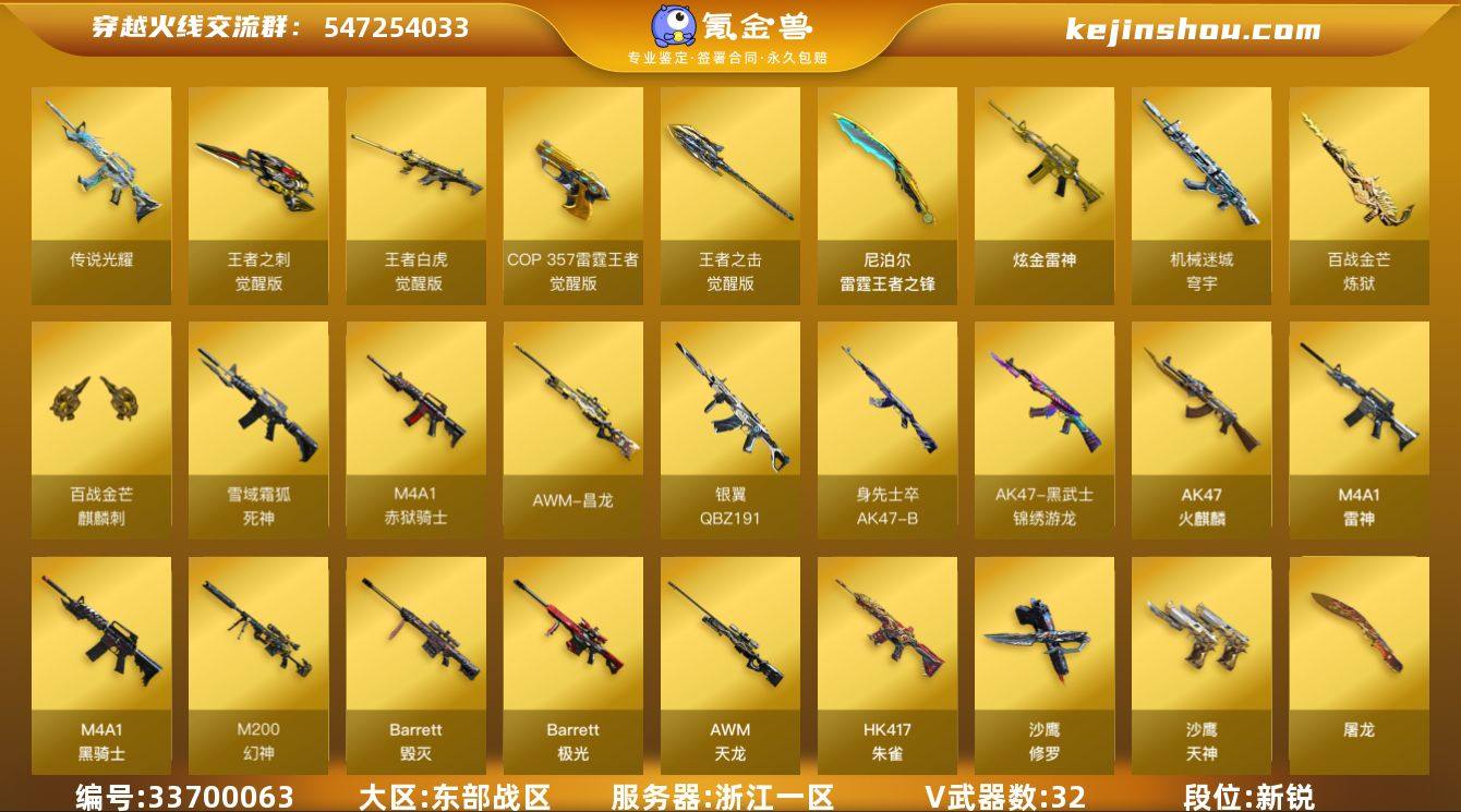 【959525】浙江一区-40V-7王者武器数-1炫金武器数 【传说武器】:传说光耀 【热门武器】:传说光耀,HK417-朱雀,M200-幻神,金色小号,牛牛-AK47,M4A1-黑骑士,斯泰尔-蝴蝶,羊驼玩偶,沙鹰-修罗*2 【王者炫金武器】:雷霆王者之锋,炫金雷神 【音效卡】:M4A1-黑骑士音效卡,沙鹰-修罗-盛典舞曲音效卡*2,麒麟刺-百战金芒-盛典舞曲音效卡,炼狱-百战金芒-庆典舞曲音效卡,死神-雪域霜狐-怀旧音效卡 【皮肤】:雷神-宇航兔皮肤,M4A1-再燃火线,火麒麟-华夏之心,火麒麟-轻羽皮肤,火麒麟-平天大圣,毁灭-黑大圣皮肤,毁灭-虹光风暴 皮肤,AK47-B-常胜将军-刘备*3,修罗-能量核心,轻型军用手斧-再燃火线 【角色】:研,零·纪元,战地猎狐,王者春,王者涂鸦,王者-魅影,雪域霜狐,云海玲珑,葵-阿尔法武装,暗夜-X,芳心审判者,飞虎队-X,风暴女*2,疾风,兰妹妹,猎狐者-追月,灵狐者-X,麻雀,潜龙队-X,青霞仙子,斯沃特-X,铁骑荣耀,游珑儿,潘多拉-N 【人偶武器】:斯泰尔-蝴蝶,牛牛-AK47,迷你深渊冰龙,迷你波特博士*2,迷你曼提柯尔,夺魂,迷你牛牛*2,生化手雷-机甲核心*2,深渊终结者手雷,闪光弹-小乔,闪光弹-貂蝉,高爆手雷-大乔,巴雷特-赏金猎人,迷你...