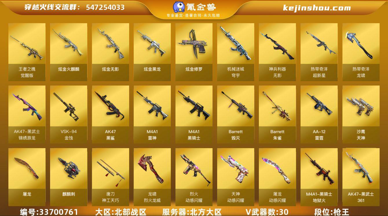 【959555】北方大区-31V-3王者武器数-4炫金武器数 【热门武器】:M4A1-黑骑士 【王者炫金武器】:高爆手雷-雷霆王者,炫金火麒麟,炫金无影,炫金黑龙,炫金修罗 【音效卡】:烈火-动感闪耀 音效卡,M4A1-黑骑士音效卡 【皮肤】:毁灭-英雄计划 皮肤,黑骑士-地狱火,AK47-黑武士-361,修罗-能量核心,屠龙-星火燎原,麒麟刺-萌杀皮肤 【角色】:葵,奇洋探员,乔伊教练,初恋灵狐,飞虎队-X,风暴女,嘉年华灵狐,娟娟,0号玩家,灵狐者-X,龙儿,麻雀,潘多拉-X,潘多拉-甜心教官,青霞仙子,兔囡囡,维纳斯,影武者-X,团团 【人偶武器】:迷你宝贝,迷你深渊冰龙 【英雄级武器】:M4A1-雷神,M4A1-黑骑士,AK47-黑鲨,QBZ03-天罚,无影-神兵利器,黑武士-锦绣游龙,超新星-热带奇洋,烈火-动感闪耀,王者之魄-觉醒版,超新星-悦享-觉醒版,机械迷城-穹宇,Barrett-毁灭,Barrett-朱雀,VSK-94-金蚀,AA-12-雷霆,沙鹰-天神,天神-动感闪耀,屠龙,麒麟刺,唐刀-神工天巧,屠龙-动感闪耀,龙啸-热带奇洋,龙啸-烈火龙威,高爆手雷-幻灵,高爆手雷-神工天巧,手雷-动感闪耀,手雷-热带奇洋,高爆手雷-雷霆王者-觉醒版,闪光弹-幻灵,闪光弹-神工天巧,烟雾弹-神工天巧 【其...