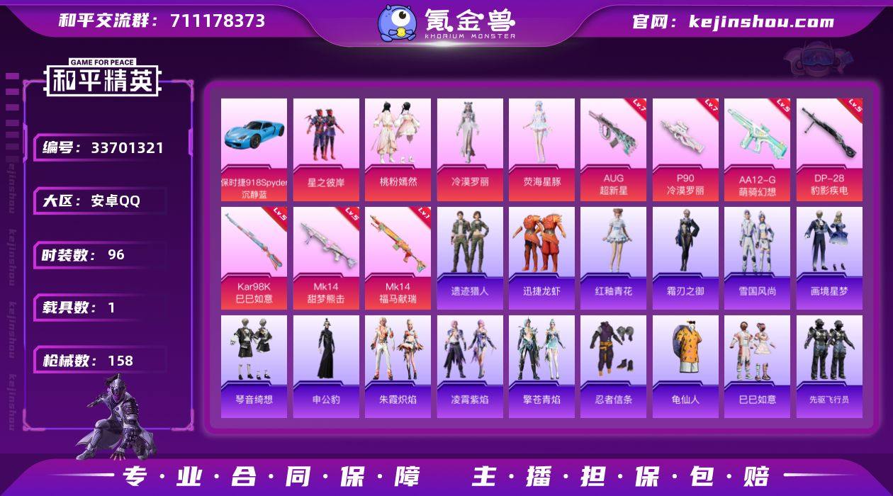 安卓 手Q-4粉装-7特效枪-1载具-1粉色飞行器-45757热力值-6王牌印记-96套装-158枪皮 【热门品类】:套装-忍者信条,套装-龟仙人 【粉色套装】:粉装-星之彼岸,粉装-桃粉嫣然,角色-冷漠罗丽,角色-荧海星豚 【粉色枪皮等级】:AUG-超新星(七级),P90-冷漠罗丽(七级),Kar98K-巳巳如意(五级),Mk14-甜梦熊击(五级),Mk14-福马献瑞(一级),AA12-G-萌骑幻想(五级),DP-28-豹影疾电(五级) 【粉色载具】:保时捷918 Spyder(沉静蓝) 【粉色枪皮】:AUG-超新星,P90-冷漠罗丽,Kar98K-巳巳如意,Mk14-甜梦熊击,Mk14-福马献瑞,AA12-G-萌骑幻想,DP-28-豹影疾电 【粉色飞行器】:炫彩糖果飞行器 【粉色降落伞】:幻影战神降落伞,梦幻舞会降落伞,江南烟雨降落伞,忍者神龟降落伞,千金淑猫降落伞,樱桃泡泡降落伞,幻彩电音降落伞,冷漠罗丽降落伞,绯穹魔姬降落伞,炫彩糖果降落伞 【稀有套装】:套装-龟仙人,套装-巳巳如意,套装-雪国风尚,套装-迅捷龙虾,套装-遗迹猎人,套装-先驱飞行员,角色-摩登魅猫,套装-燕燕于飞,套装-鱼渊荷华,套装-粉恋花,套装-紫幽梦,套装-蓝冰羽,套装-星渊小夜曲,套装-彩虹兔,套装-云朵鹅,套装-雪绒豹,角色-时希公主,角色-灵公主,角色-...
