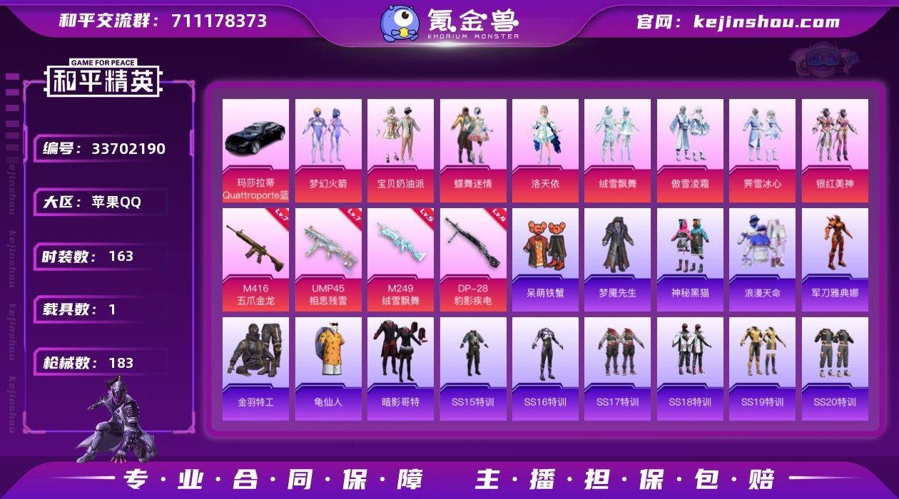 【959592】苹果【小号/11王牌印记/梦幻火箭/洛天依/暗影哥特/百万伏特背包/8粉装-4特效枪-1载具-2粉色飞行器】 手Q--61478热力值-11王牌印记-163套装-183枪皮 【热门品类】:粉装-梦幻火箭,套装-浪漫天命,角色-军刀雅典娜,套装-金羽特工,套装-龟仙人,套装-暗影哥特 【粉色套装】:粉装-宝贝奶油派,粉装-蝶舞迷情,粉装-梦幻火箭,角色-洛天依,粉装-绒雪飘舞,粉装-傲雪凌霜,粉装-霁雪冰心,粉装-银红美神 【粉色枪皮等级】:M416-五爪金龙(七级),UMP45-相思残雪(七级),M249-绒雪飘舞(五级),DP-28-豹影疾电(四级) 【粉色载具】:玛莎拉蒂Quattroporte(夜幕蓝) 【粉色枪皮】:M416-五爪金龙,UMP45-相思残雪,M249-绒雪飘舞,DP-28-豹影疾电 【粉色飞行器】:梦幻火箭飞行器,绒雪飘舞飞行器 【粉色降落伞】:至尊龙雀降落伞,王牌四分卫降落伞,星之彼岸降落伞,齐天大圣降落伞,洛神天依降落伞,蓝莓炮弹降落伞,暗星紫秘降落伞,百合蜜语降落伞,橘柚倾心降落伞,筑梦精灵降落伞,甜梦小狐降落伞,绒雪飘舞降落伞,垂柳戏鸭降落伞,音爆索尼克降落伞 【稀有套装】:套装-龟仙人 【稀有枪皮】:AKM-冰凉西瓜,AKM-墨染幽兰,AKM-夜灯,AKM-彩虹符号,AKM-灼热熔...