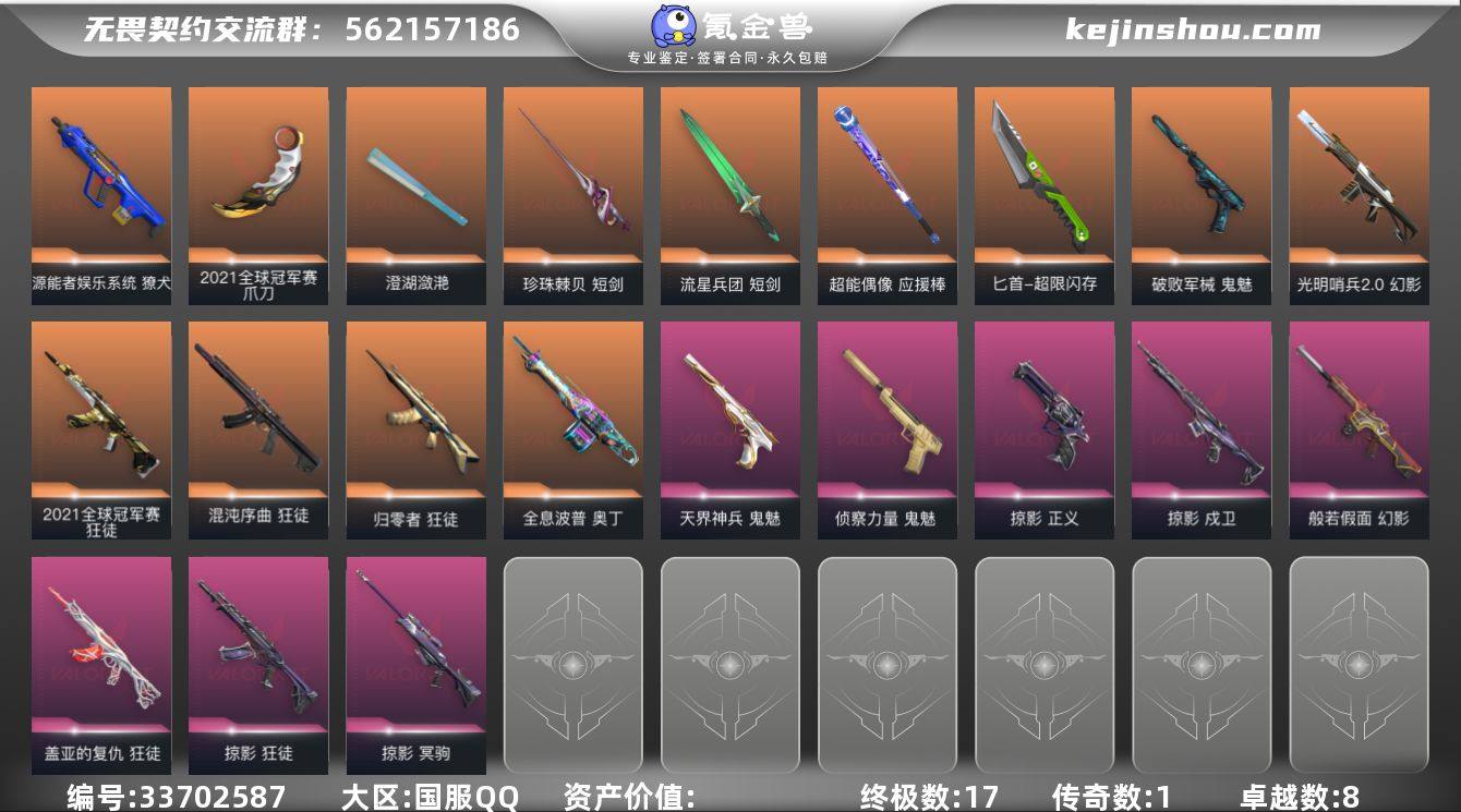 【套装】:2021全球冠军赛套装,掠影套装 【英雄】:幻棱,炼狱,维斯,暮蝶,钛狐,壹决,铁臂,捷风,雷兹,幽影,不死鸟,贤者,猎枭,蝰蛇,零,芮娜,奇乐,尚勃勒,霓虹,斯凯,夜露,星礈,K/O,海神,盖可,黑梦,钢锁 【近战武器】:近战武器-2021全球冠军赛 爪刀,近战武器-紫金爪刀,近战武器-澄湖潋滟,近战武器-埃芒迪尔大剑,近战武器-珍珠棘贝 短剑,近战武器-流星兵团 短剑,近战武器-超能偶像 应援棒,近战武器-超限闪存 匕首,近战武器-天玄刀,近战武器-天御刀,近战武器-影刃 【狂徒】:狂徒-2021全球冠军赛,狂徒-归零者,狂徒-混沌序曲,狂徒-掠影,狂徒-盖亚的复仇,狂徒-超能偶像,狂徒-流星兵团 【幻影】:幻影-光明哨兵//2.0,幻影-般若假面,幻影-超限闪存,幻影-珍珠棘贝,幻影-聚合之力 【戍卫】:戍卫-掠影,戍卫-超能偶像,戍卫-珍珠棘贝,戍卫-浮光跃金,戍卫-战术熊与伙伴们 【獠犬】:獠犬-源能者娱乐系统,獠犬-采蜜小蜂队,獠犬-复古浪潮,獠犬-模拟赫兹 【冥驹】:冥驹-掠影,冥驹-复古浪潮,冥驹-模拟赫兹 【飞将】:飞将-聚合之力,飞将-战术熊与伙伴们 【莽侠】:莽侠-超限闪存,莽侠-深海水族,莽侠-纤云弄巧 【战神】:战神-采蜜小...