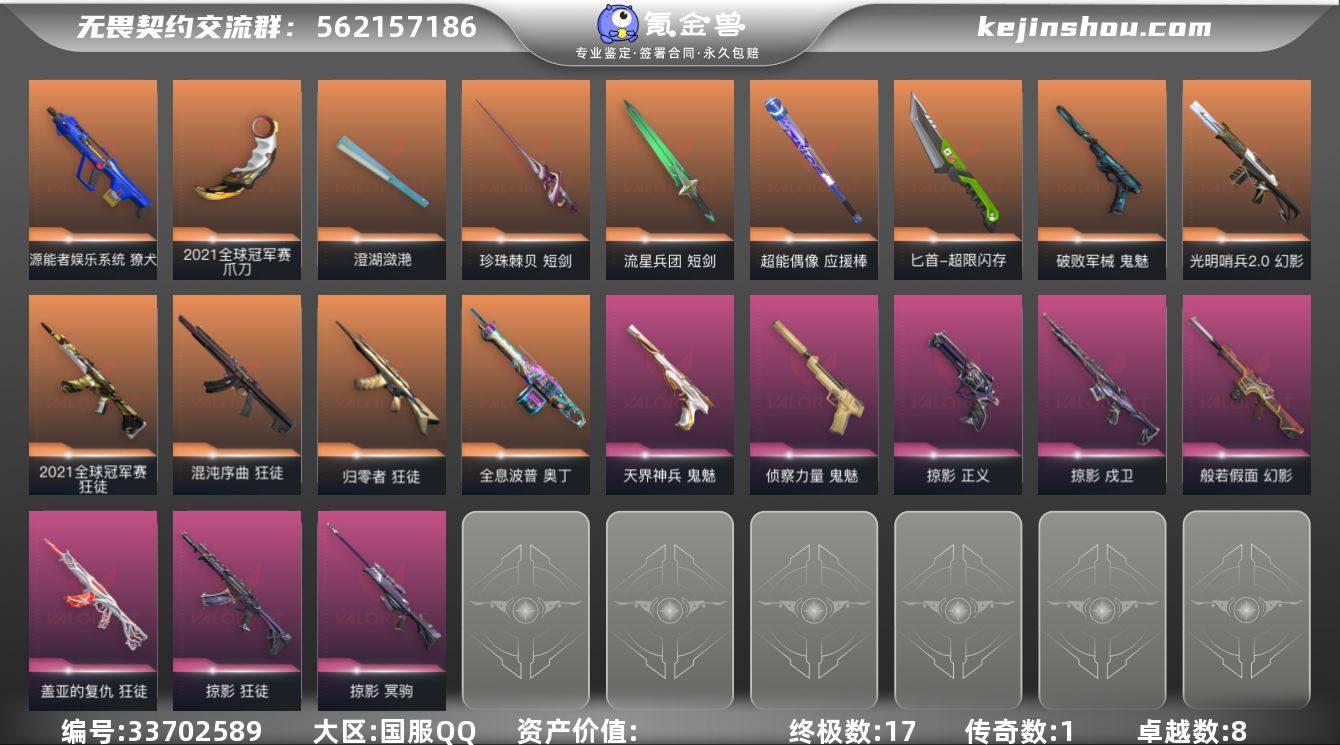 【kywwqy283】【套装】:2021全球冠军赛套装,掠影套装 【英雄】:幻棱,炼狱,维斯,暮蝶,钛狐,壹决,铁臂,捷风,雷兹,幽影,不死鸟,贤者,猎枭,蝰蛇,零,芮娜,奇乐,尚勃勒,霓虹,斯凯,夜露,星礈,K/O,海神,盖可,黑梦,钢锁 【近战武器】:近战武器-2021全球冠军赛 爪刀,近战武器-紫金爪刀,近战武器-澄湖潋滟,近战武器-埃芒迪尔大剑,近战武器-珍珠棘贝 短剑,近战武器-流星兵团 短剑,近战武器-超能偶像 应援棒,近战武器-超限闪存 匕首,近战武器-天玄刀,近战武器-天御刀,近战武器-影刃 【狂徒】:狂徒-2021全球冠军赛,狂徒-归零者,狂徒-混沌序曲,狂徒-掠影,狂徒-盖亚的复仇,狂徒-超能偶像,狂徒-流星兵团 【幻影】:幻影-光明哨兵//2.0,幻影-般若假面,幻影-超限闪存,幻影-珍珠棘贝,幻影-聚合之力 【戍卫】:戍卫-掠影,戍卫-超能偶像,戍卫-珍珠棘贝,戍卫-浮光跃金,戍卫-战术熊与伙伴们 【獠犬】:獠犬-源能者娱乐系统,獠犬-采蜜小蜂队,獠犬-复古浪潮,獠犬-模拟赫兹 【冥驹】:冥驹-掠影,冥驹-复古浪潮,冥驹-模拟赫兹 【飞将】:飞将-聚合之力,飞将-战术熊与伙伴们 【莽侠】:莽侠-超限闪存,莽侠-深海水族,莽侠-纤云弄巧 【战神】...