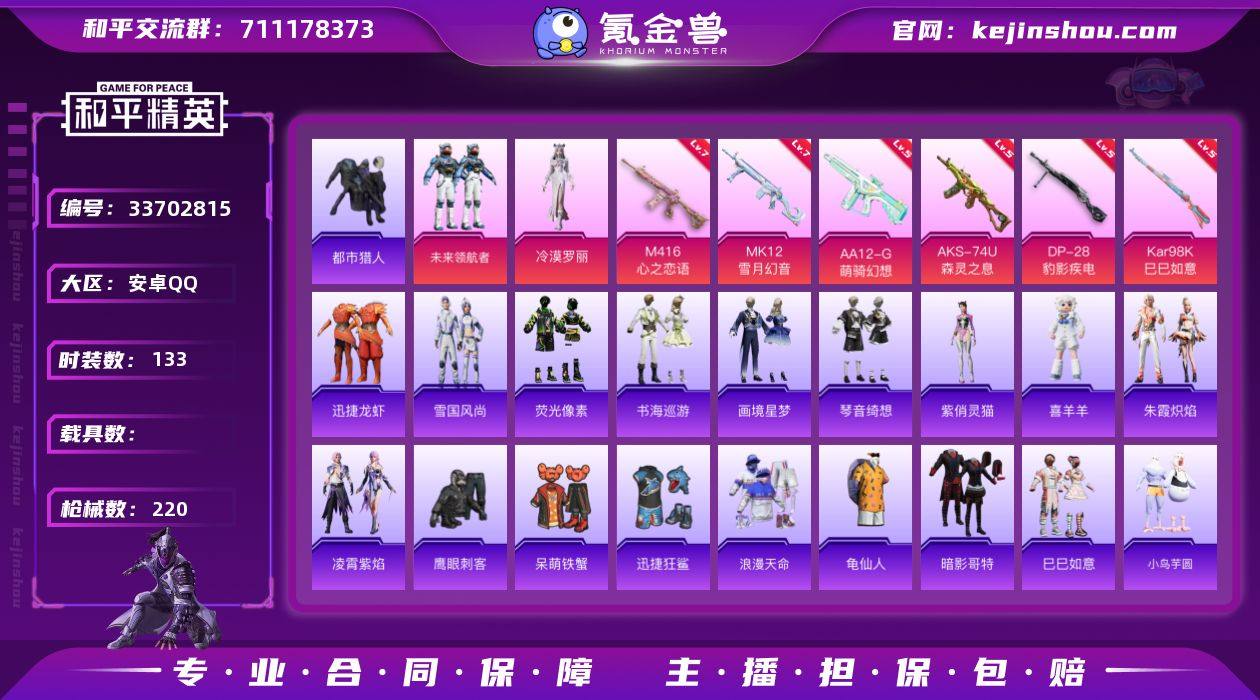 【959619】安卓 【小号 套装-浪漫天命/套装-都市猎人/套装-暗影哥特/M416-心之恋语(七级)】手Q-2粉装-6特效枪-0载具-3粉色飞行器-56970热力值-11王牌印记-133套装-220枪皮 【热门品类】:套装-浪漫天命,套装-都市猎人,套装-龟仙人,套装-暗影哥特 【粉色套装】:粉装-未来领航者,角色-冷漠罗丽 【粉色枪皮等级】:M416-心之恋语(七级),AKS-74U-森灵之息(五级),Kar98K-巳巳如意(五级),MK12-雪月幻音(七级),AA12-G-萌骑幻想(五级),DP-28-豹影疾电(五级) 【粉色枪皮】:M416-心之恋语,AKS-74U-森灵之息,Kar98K-巳巳如意,MK12-雪月幻音,AA12-G-萌骑幻想,DP-28-豹影疾电 【粉色飞行器】:炫彩糖果飞行器,繁龙极客飞行器,幻星舰长飞行器 【粉色降落伞】:绝对恒星降落伞,炫光之旅降落伞,繁龙极客降落伞,精灵梦叶罗丽降落伞,墨龙九天降落伞,樱桃泡泡降落伞,幻彩电音降落伞,喜羊羊与灰太狼降落伞,异瞳寒姬降落伞,炫彩糖果降落伞,鸢尾珑雾降落伞 【稀有套装】:套装-龟仙人,套装-巳巳如意,套装-小鸟芋圆,套装-荧光像素,套装-雪国风尚,套装-炫彩糖果,套装-迅捷龙虾,套装-雏菊兔兔,套装-萝兰蝴蝶,角色-拉斐尔,套装-先驱飞行员,套装-糖糖葫芦,套装-...
