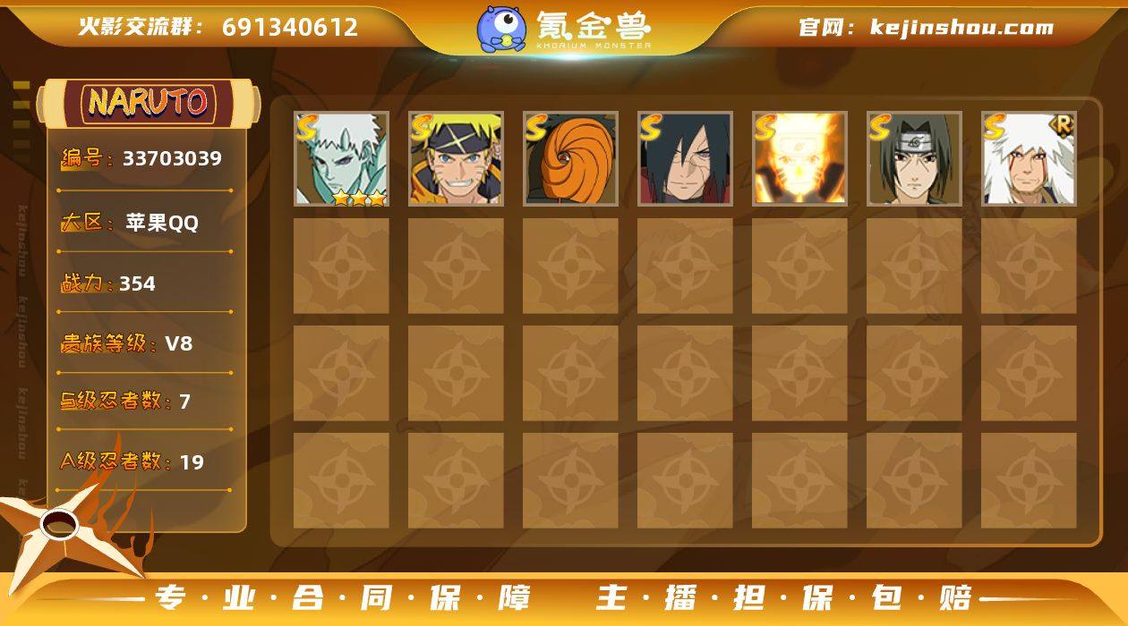 实名: 可修改 贵族等级: V8 S忍数: 7 A忍数: 19 战力值(万): 354 S级忍者: 宇智波鼬 「须佐能乎」,自来也 「舞之豪杰」,漩涡鸣人 「九喇嘛连结」,宇智波斑「秽土转生·解」,宇智波斑「五影会谈」,漩涡鸣人·宇智波佐助,宇智波带土「十尾人柱力」 亮点: 【优质装备】:漩涡鸣人 「九喇嘛连结」,宇智波斑「秽土转生·解」