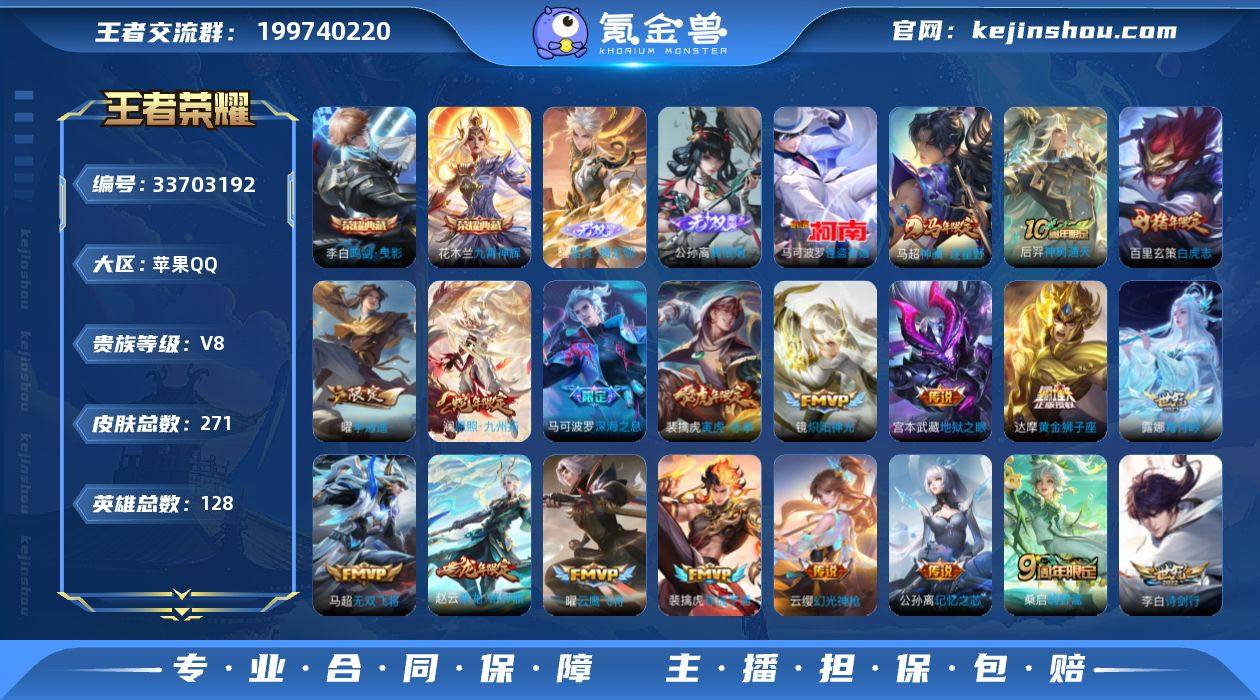 【王者荣耀】珍品无双0 典藏2 无双2 珍品传说1 传说25 史诗77 英雄128 皮肤271 贵族8级 荣耀典藏:九霄神辉|鸣剑·曳影__无双皮肤:离恨烟|器灵·螭龙剑__珍品传说:怪盗基德__传说皮肤:鸣野蒿|深海之息|无双飞将|炽阳神光|启明星使|地狱之眼|黄金狮子座|黄金射手座|云鹰飞将|李逍遥|记忆之芯|白虎志|吕布-曦玄引|马超-琥珀纪元|诗剑行|霜月吟|逐花归海|乘龙·铭钟鼎|寅虎·赤拳|幻光神枪|祥瑞亨通|愿照·九州拓|神树通天|花木兰-异界灵契|神骥·逐星野__稀有限定:至尊宝|神威|孙行者|李小龙|百解令|古海寻踪|海滩派对|海盐诗旅|皇家上将|剑破天穹|江河有灵|魔术师|女武神|擒涛扼浪|青焰无极|燃音魔法|荣光圣徽|探海日志|天穹祈灯|妄想食味|纤云弄巧|阴阳师|原初追逐者|暗夜猫娘|暗隐猎兽者|暗渊魔法|缤纷独角兽|冰冠公主|冰雪圆舞曲|乘风破浪|大乔-猫狗日记|地狱岩魂|伽罗-琥珀纪元|功夫厨神|鬼剑武藏|黄金分割率|节奏热浪|金属风暴|李元芳-蔬乡物语|魅力维加斯|魅语|梦奇-顽趣|青蛇|热力回旋|绅士熊喵|圣诞狂欢|鲁班七号-蔬乡物语|水果甜心|水晶猎龙者|孙策-猫狗日记|天秀·启明|星夜王子|摇滚巨星|鹰眼统帅|幽灵船长|至美·乘鲤谣|逐浪之夏|紫霞仙子|百里守约-百相守梦|老夫子-百相守...