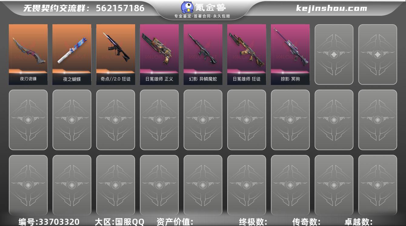 【英雄】:幻棱,炼狱,维斯,暮蝶,捷风,幽影,不死鸟,贤者,猎枭,蝰蛇,零,芮娜,奇乐,尚勃勒,霓虹,斯凯,夜露,K/O,盖可,黑梦 【近战武器】:近战武器-夜之蝴蝶,近战武器-夜刃诡镰 【狂徒】:狂徒-奇点//2.0,狂徒-超时空卫队,狂徒-日冕雄师 【幻影】:幻影-异鳞魔蛇 【冥驹】:冥驹-掠影 【VCT手枪】:标配-VCT25 x 100T 【正义】:正义-日冕雄师 【卡面】:《双城之战》拥抱 卡面,精灵大战 卡面,欢迎来到底城 卡面,南瓜盛典 卡面,热舞环节 卡面,正义的化身 卡面,梦幻奶茶 卡面,零点嗅探设计图 卡面,无畏契约GO!第一卷:芮娜 卡面,清除名单 卡面,无畏契约GO!第一卷:零 卡面,无垠星环 卡面,《双城之战》金克丝 卡面,逆向独行 卡面 ,暗枪 卡面,铁臂设计图 卡面,代号红色 卡面,新兵报到 卡面,V契约 卡面,无畏契约 卡面 【喷漆】:嘭! 喷漆,都算到了 喷漆,控场勿近 喷漆,捷风差距 喷漆,审判之爪 喷漆,我的刀呢? 喷漆,买装还是存钱 喷漆,蕊形灯 喷漆,老铁困了 喷漆,胜利属于无畏契约 喷漆,GLHF 喷漆,无畏契约 喷漆 【挂饰】:伞绳 挂饰,《双城之战》小蛋糕 挂饰,第九季//第三幕 纪念币 挂饰,第九季//第二幕 纪念币 挂饰,薰...
