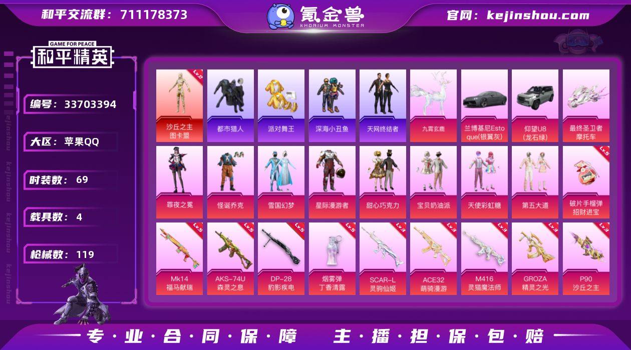 【LHPD807】【特价出售/店主推荐】苹果 手Q-1神装-8粉装-15特效枪-4载具-13粉色飞行器-46667热力值-6王牌印记-69套装-119枪皮 【红色神装等级】:沙丘之主-图卡盟(二级) 【红色角色神装】:沙丘之主-图卡盟 【热门品类】:粉装-怪诞乔克,粉装-雪国幻梦,套装-浪漫天命,套装-都市猎人,套装-派对舞王,套装-深海小丑鱼,套装-小丑鱼,套装-天网终结者,套装-暗影哥特 【粉色套装】:粉装-星际漫游者,粉装-怪诞乔克,粉装-甜心巧克力,粉装-宝贝奶油派,粉装-天使彩虹糖,粉装-雪国幻梦,粉装-第五大道,角色-罪夜之冕 【粉色枪皮等级】:SCAR-L-灵驹仙姬(三级),M416-灵猫魔法师(三级),GROZA-精灵之光(三级),ACE32-萌骑漫游(三级),UMP45-萌骑冒险(二级),AKS-74U-森灵之息(五级),P90-沙丘之主(三级),Kar98K-圣域龙灵(一级),Mk14-福马献瑞(五级),M200-梦海之灵(三级),DP-28-豹影疾电(五级),PKM-萌骑夺宝(二级),烟雾弹-丁香清露(五级),燃烧瓶-天降桃花(二级),破片手榴弹-招财进宝(五级) 【粉色载具】:兰博基尼Estoque(银翼灰),仰望U8(龙石绿),最终圣卫者摩托车,僚机-圣域龙宝,九霄玄鹿 【粉色枪皮】:SCAR-L-灵驹仙姬,M416-灵猫魔法师,GROZA-精灵之光...