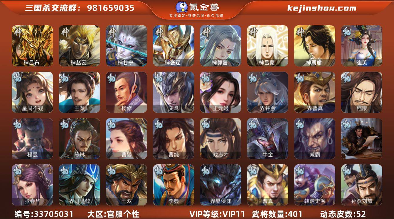 【14790323】官阶:大将军;VIP等级:VIP11;史诗武将数量:53;动态皮肤数量:52;武将总数:401;史诗宝珠数量:19;将魂数量:3532;神将:5;魏国史诗武将:24;蜀国史诗武将:12;吴国史诗武将:8;群史诗武将:18