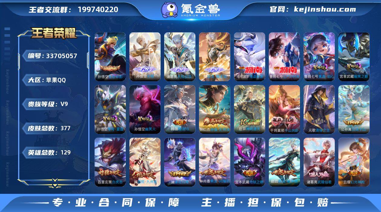 MCK634396 【金标猴子+妲己!猴子+诸葛+曜3无双!】 皮肤数量377 印记总数11 【V9】 【至尊星耀】 【可修改】 账号类型7 省标(金标)2 无双3 荣耀典藏1 珍品2 星元皮肤4 传说26 史诗97 账号类型:全能号,女号,软辅号,射手号,上单号,中单号,打野号; 省标(金标):省金标孙悟空,省金标妲己; 无双:孙悟空_无相,诸葛亮_天机白泽,曜_器灵螭龙剑; 荣耀典藏:孙悟空_全息碎影; 珍品:马可波罗_怪盗基德,鲁班七号_江户川柯南; 星元皮肤:孙悟空_零号雷霆,孙悟空_幽冥火,鲁班_寅虎·焰心,宫本武藏_幽冥之眼; 传说:韩信_踏浪归,百里玄策_白虎志,狄仁杰_神骥·赴朔漠,后羿_黄金射手座,宫本武藏_地狱之眼,后羿_神树通天,干将莫邪_千山共赴,元歌_诡秘之主,孙悟空_地狱火,干将莫邪_久胜战神,公孙离_云诺千山,云缨_幻光神枪,澜_愿照九州拓,虞姬_启明星使,桑启_鸣野蒿,赵云_乘龙铭钟鼎,孙尚香_乘龙问璇玑,澜_逐花归海,鲁班七号_寅虎瑞焰,刘备_时之恋人,干将莫邪_画中仙,孙悟空_齐天大圣,吕布_怒海麟威,诸葛亮_武陵仙君,赵云_淬星耀世,孙悟空_零号·赤焰; 史诗:海月_海之女神,小乔_缤纷独角兽,达摩_星君·亢金,不知火舞_魅语,上官婉儿_春霖...