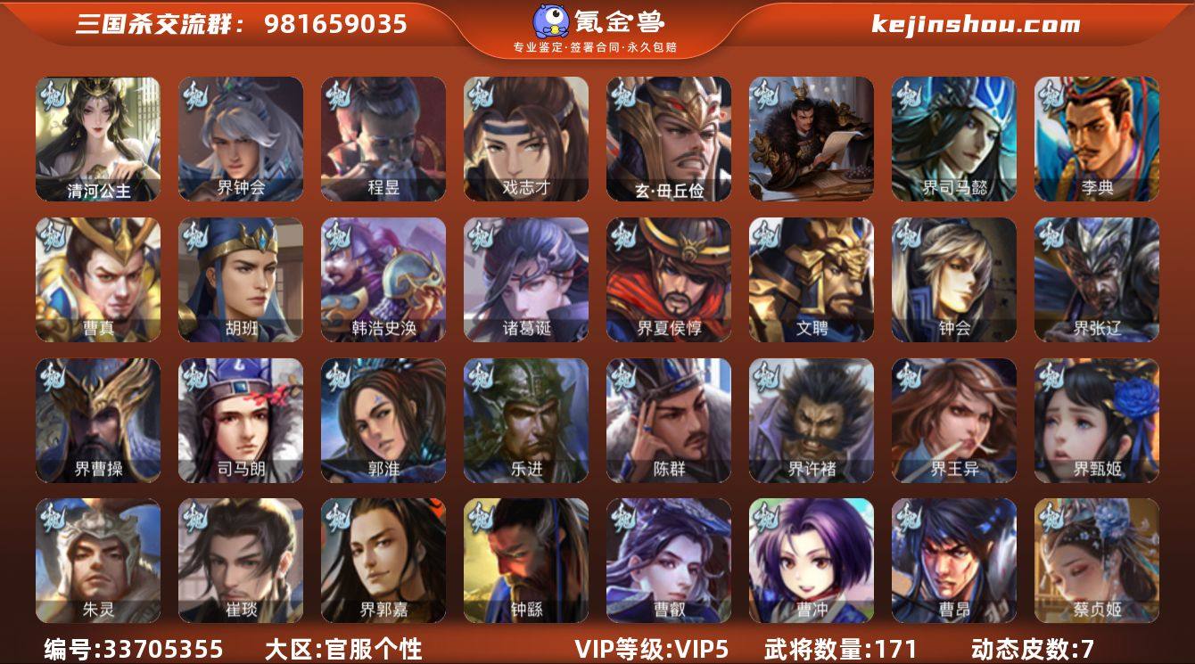 【JYSGS326】官阶:中军将军 VIP等级:VIP5级 史诗武将数:6 动态皮肤数:7 武将总数:171 史诗宝珠数:29 元宝数:18 将魂数:2173 /界钟会/程昱/戏志才/清河公主/界黄忠/谋陆逊/蔡贞姬/崔琰/界曹操/界司马懿/界夏侯惇/界张辽/界许褚/界郭嘉/界甄姬/钟会/曹冲/郭淮/曹真/韩浩史涣/陈群/曹叡/钟繇/界王异/诸葛诞/曹昂/SP关羽/SP姜维/文聘/乐进/司马朗/李典/朱灵/胡班/玄·毌丘俭/孟达-魏/骥李典/华雄/袁术/界华佗/界袁术/界颜良文丑/公孙瓒/伏皇后/李儒/蔡夫人/界公孙瓒/界刘表/刘虞/伏完/张宝/严白虎/蹋顿/张鲁/刘琦/樊稠/鲍信/谋庞统/陈震/费祎/刘巴/界刘备/界马超/界诸葛亮/关兴张苞/廖化/关平/简雍/刘封/吴懿/周仓/张松/界法正/界关兴张苞/界张嶷/马良/夏侯霸/SP孙尚香/关银屏/SP徐庶/张翼/诸葛果/彭羕/吴-糜芳傅士仁/谋周瑜/张温/界甘宁/界吕蒙/界黄盖/界周瑜/界大乔/界陆逊/程普/韩当/潘璋马忠/虞翻/朱然/孙鲁班/朱桓/顾雍/界朱治/诸葛瑾/孙鲁育/大乔小乔/潘濬/吕岱/凌操/清河公主-魅影萦心(动态)/SP孙尚香-一箭定情/费祎-安民护祚(动态)/诸葛亮-龙年限定(动态)/周处-义除三害(动态)/陆逊-蛇年清明(动态)/灵雎-霜刃绚练(动态)