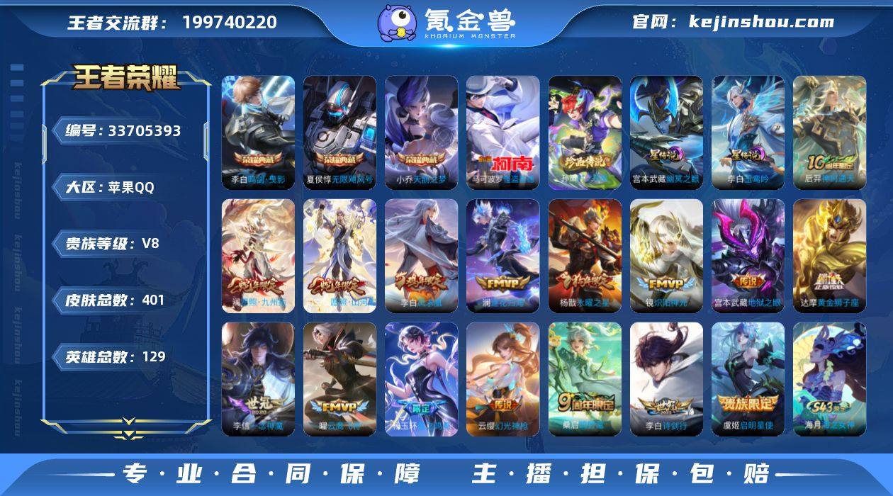 【精品国标号·58段游走·51段打野·准1.3w小国赵怀真·万战小国杨戬1.1w金标李白·万战金标澜·准1.1w金标杨玉环·1.1w金标廉颇·12热门金标·16传说·玉鸾吟·怪盗基德·孙策时之奇旅·鸣剑曳影·天鹅之梦·无限飓风号·星之鸣奏·愿照山河定·诗剑行·永曜之星·凤求凰·可二次】YXw25611-苹果Q-129英雄-401皮肤-35王者印记-300铭文-贵族积分9w【贵族8】【3典藏·2星传说·16传说·1天幕·17按键】【因赛季更新游戏段付以上号为准!】 【英雄全皮】:刘禅全皮,刘邦全皮,孙权全皮,苍全皮,猪八戒全皮,敖隐全皮,司空震全皮,戈娅全皮,空空儿全皮,影全皮 【荣耀典藏】:夏侯惇无限飓风号,小乔天鹅之梦,李白鸣剑曳影 【珍品传说】:孙策时之奇旅,马可波罗怪盗基德 【小国标】:小国标杨戬,小国标赵怀真 【星元皮肤】:李白玉鸾吟,宫本武藏幽冥之眼 【天幕】:共赏芳华天幕 【传说皮肤】:后羿神树通天,杨玉环星之鸣奏,司空震愿照山河定,澜愿照九州拓,云缨幻光神枪,桑启鸣野蒿,澜逐花归海,李白诗剑行,镜炽阳神光,虞姬启明星使,曜云鹰飞将,李信一念神魔,达摩黄金狮子座,杨戬永曜之星,李白凤求凰,宫本武藏地狱之眼 【限定皮肤】:白起狰,蔡文姬夏日便利店,虞姬夏日便利店,姜子...