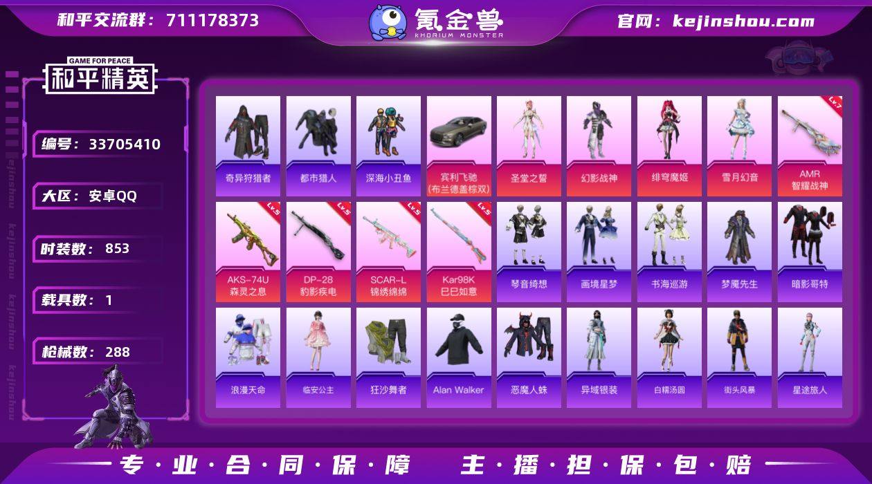 【特价出售】安卓Q-3稀有1载具4粉装8特效枪18热门215套装288枪皮 81436热力值 19印记 历史传奇王牌17星 【3稀有】 奇异狩猎者 都市猎人 浪漫天命 【1载具】 宾利飞驰布罗德盖棕双色 【4粉装】 圣堂之誓 绯穹魔姬 雪月幻音 幻影战神 【8特效枪】 SCAR-L-锦绣绵绵 (5级) AKS-74U-森灵之息 (5级) Kar98K-巳巳如意 (5级) DP-28-豹影疾电 (5级) AMR-智耀战神 (7级) 信号枪-金乌曜日 (6级) Mk14-福马献瑞 (5级) UMP45-萌骑冒险 (5级) 【18热门】 龟仙人 暗夜之虎 恶魔人蛛 梦魇先生 暗夜之虎 深海小丑鱼 裁决冥王 暗影哥特 团圆交子 瑞龙福将 狂沙舞者 破蛋小黄鸡 极速红龙 AKM-奇异狩猎者 M762-奇异狩猎者 M762-瑞龙福将 M24-奇异狩猎者 S686-奇异狩猎者 【2头盔】 幻影战神头盔 金羽特工头盔 【3背包】 甜心宝贝背包 幻影战神背包 神秘黑猫背包