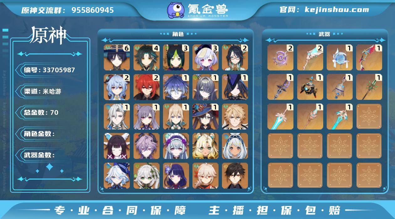【原神】冒险等级:60,五星数量:39,五星角色:流浪者 * 6命,魈 * 4命,七七 * 3命,提纳里 * 3命,闲云 * 2命,迪卢克 * 2命,甘雨 * 2命,那维莱特 * 1命,菈乌玛 * 1命,菲林斯 * 1命,刻晴 * 1命,莫娜 * 1命,琴 * 1命,克洛琳德 * 1命,玛拉妮,希诺宁,温迪,迪希雅,钟离,梦见月瑞希,芙宁娜,纳西妲,杜林,哥伦比娅,法尔伽,枫原万叶,雷电将军__五星武器:不灭月华 * 2精,天空之翼 * 2精,星鹫赤羽,金流监督,图莱杜拉的回忆,帷间夜曲,和璞鸢,天空之傲,天空之脊,天空之刃,赦罪__四星角色:班尼特 * 6命,行秋 * 6命,香菱 * 6命,久岐忍 * 6命,珐露珊 * 6命,凝光 * 6命,迪奥娜 * 6命,砂糖 * 6命,瑶瑶 * 6命,莱依拉 * 6命,多莉 * 6命,柯莱 * 6命,卡维 * 6命,芭芭拉 * 6命,云堇 * 6命,托马 * 6命,烟绯 * 6命,重云 * 6命,辛焱 * 6命,诺艾尔 * 6命,罗莎莉亚 * 6命,菲谢尔 * 6命,北斗 * 6命,嘉明 * 6命,赛索斯 * 6命,卡齐娜 * 5命,鹿野院平藏 * 5命,五郎 * 5命,雷泽 * 4命,九条裟罗 * 3命,蓝砚 * 3命,夏洛蒂 * 3命,爱诺 * 3命,夏沃蕾 * 2命,叶洛亚 * 2命,绮良良 * 1命,米卡 * 1命,坎蒂丝 * 1命,早柚 * 1命,塔利雅 * 1命,奇偶·男性,欧洛伦,菲米尼,琳妮特,伊法,雅珂达